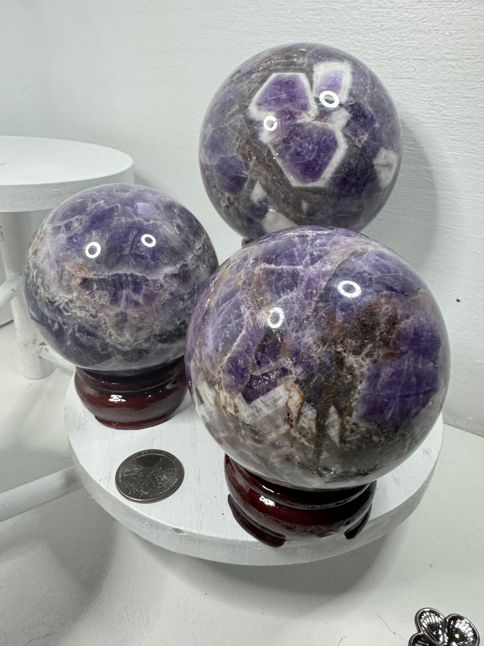 Handcrafted from natural Amethyst crystal, each sphere showcases unique patterns and hues of deep purple, reminiscent of the majestic beauty of a starlit sky. Celebrate the sacred elegance and profound energy of your Amethyst Sphere as you immerse yourself in its tranquil embrace.
