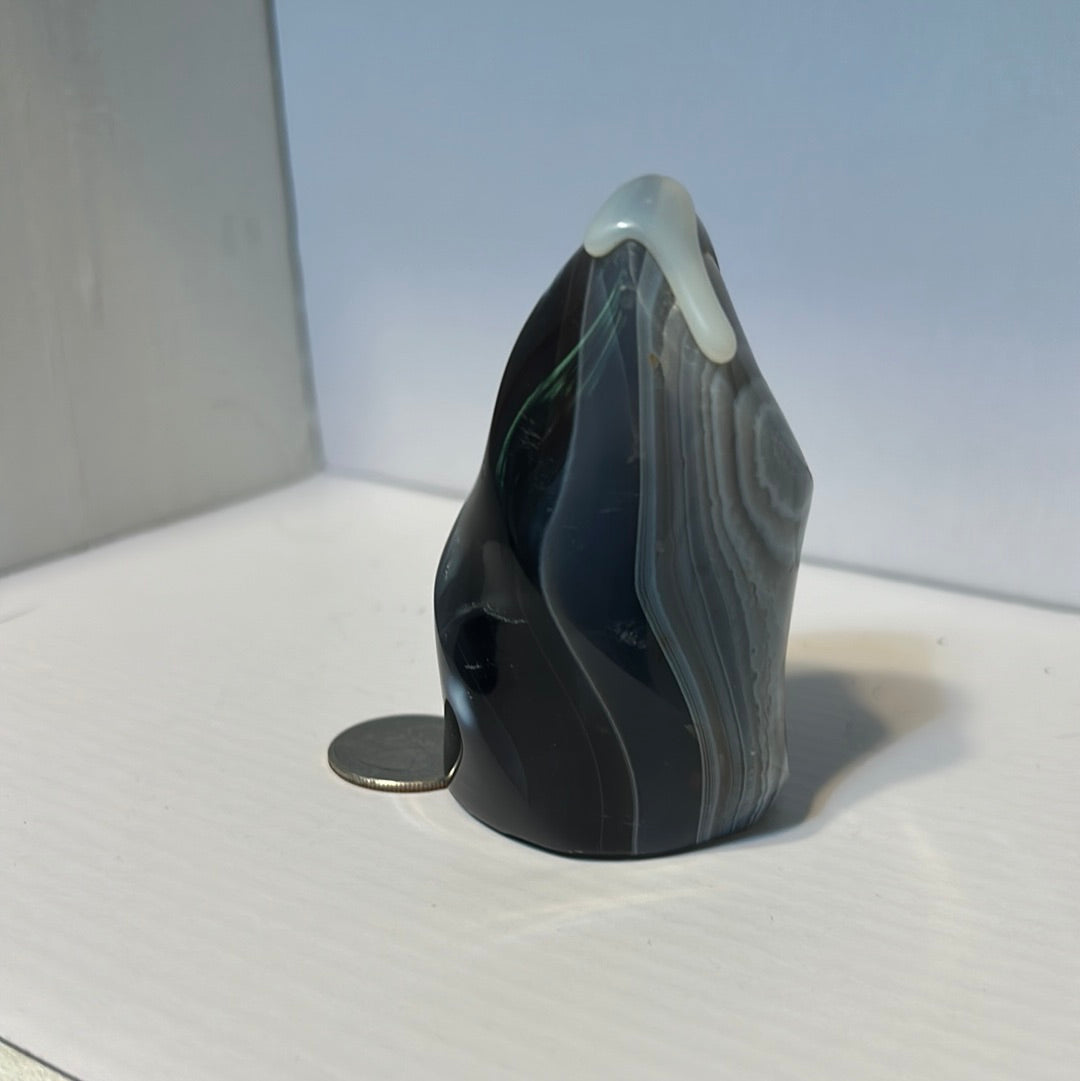 Whether displayed in your home as a symbol of harmony and renewal, used in meditation and mindfulness practices to enhance focus and clarity, or gifted to a loved one as a token of stability and grounding, our Banded Agate flame brings a touch of natural beauty and spiritual serenity to any space.