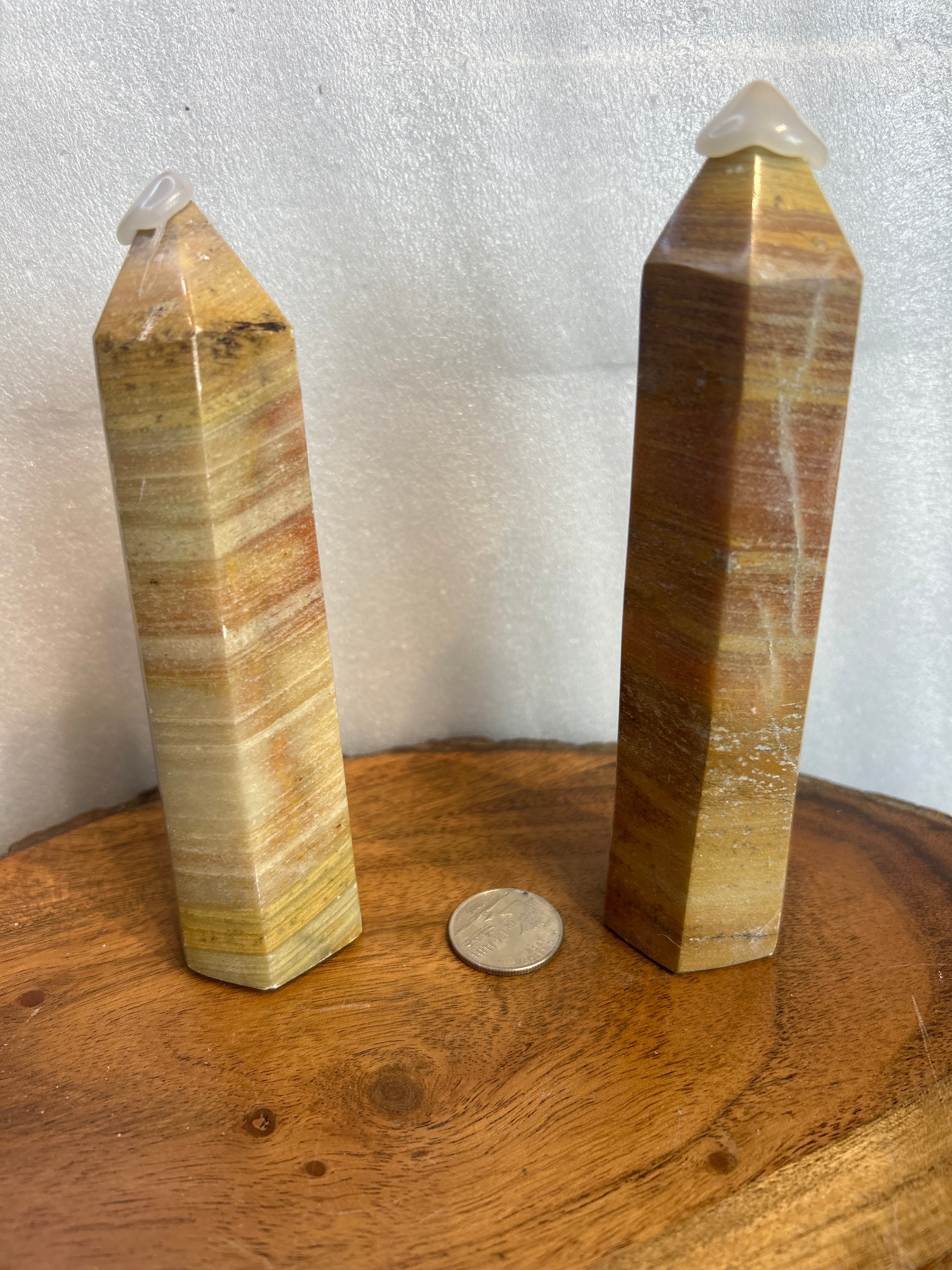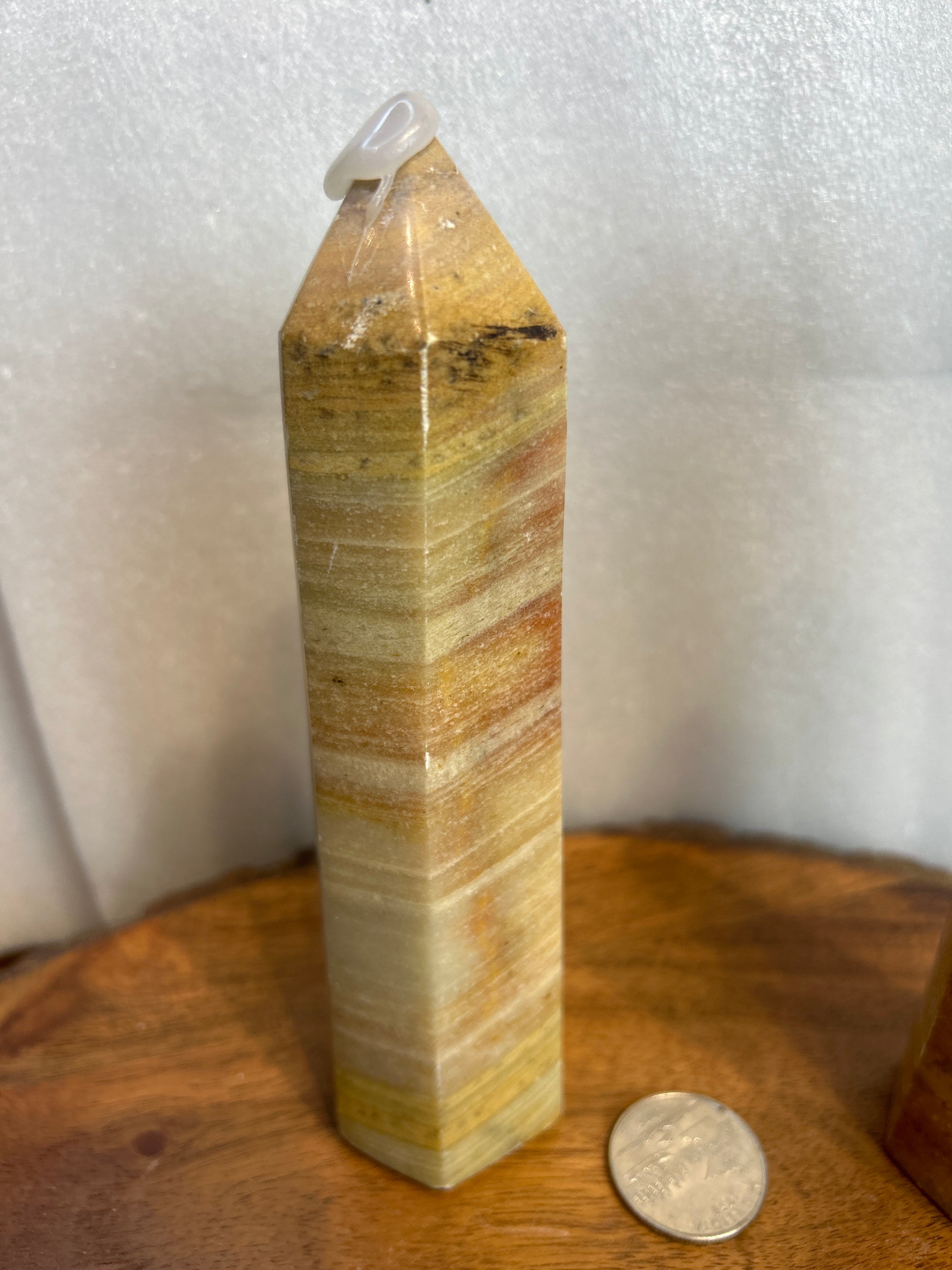 Each Yellow Banded Calcite Tower is unique in color and pattern due to natural gemstone variations, ensuring every piece is truly one of a kind.