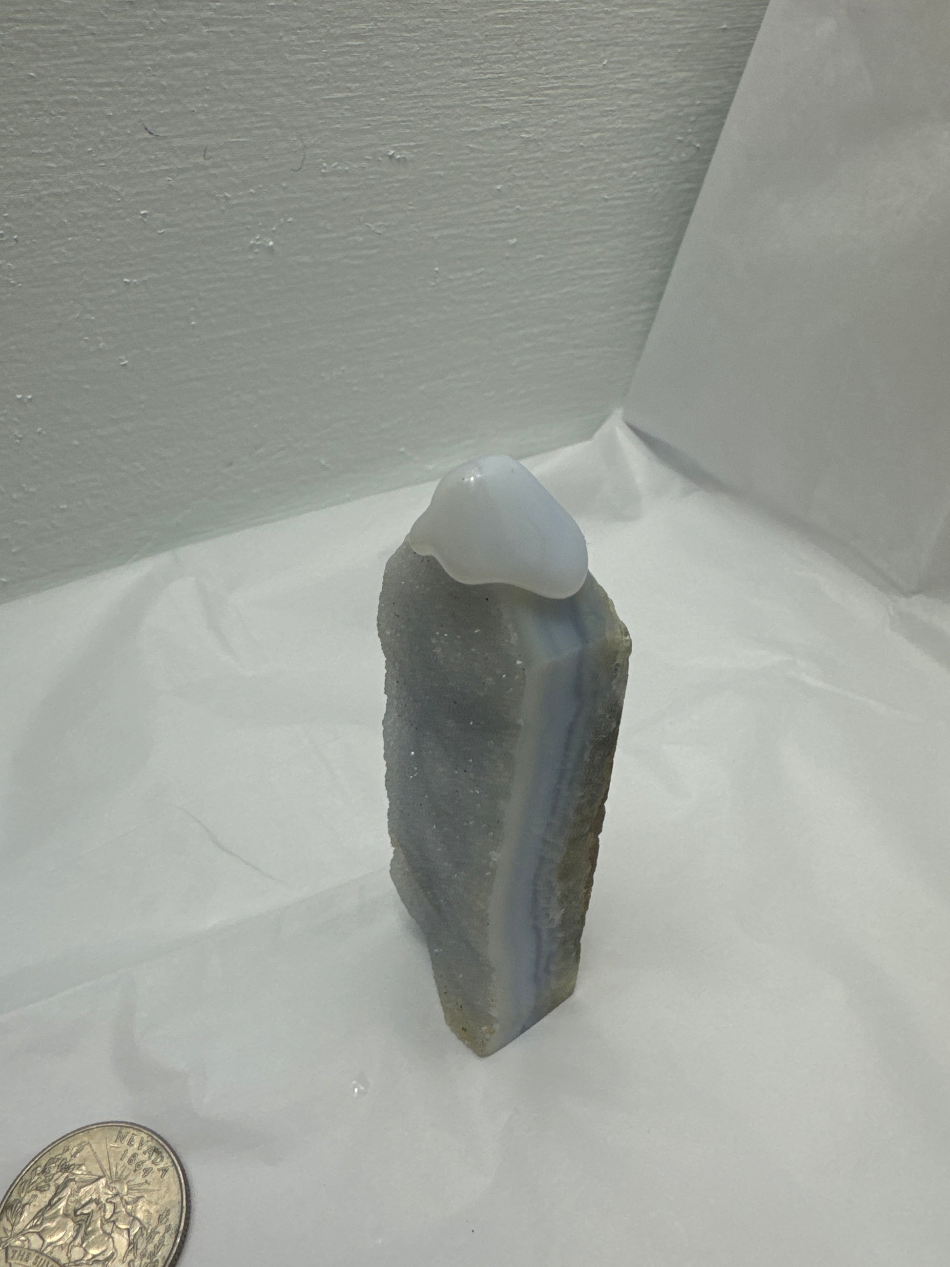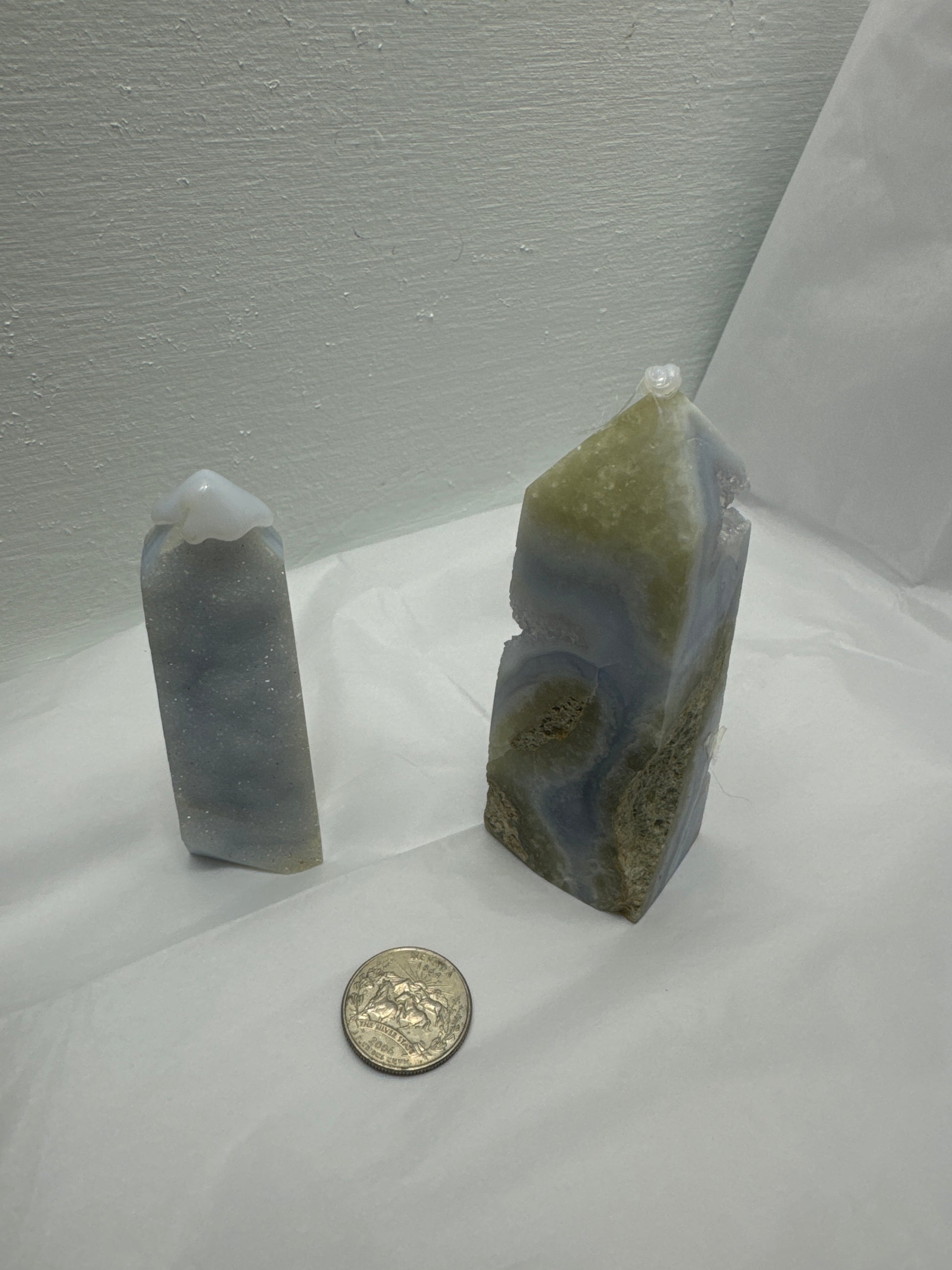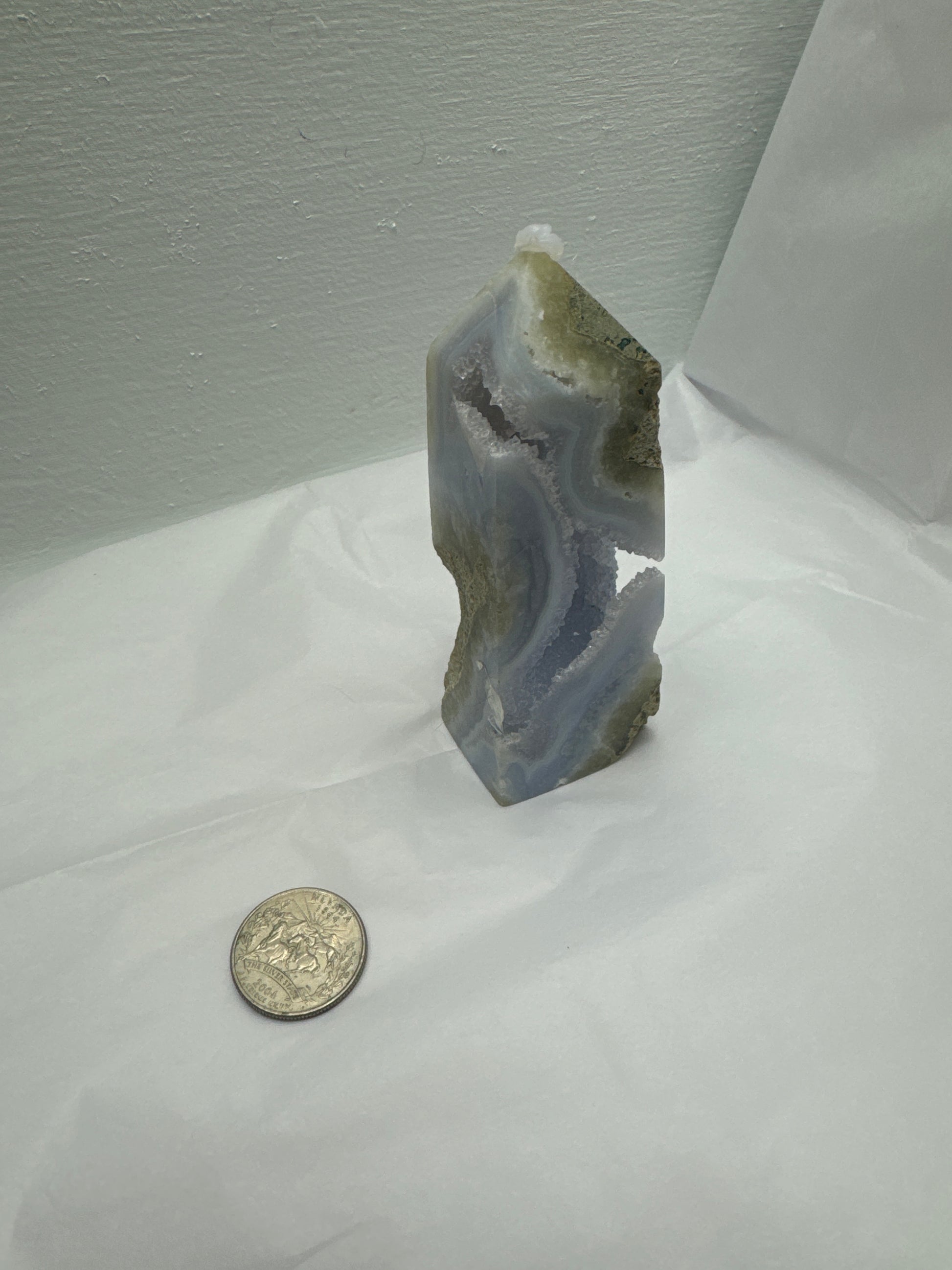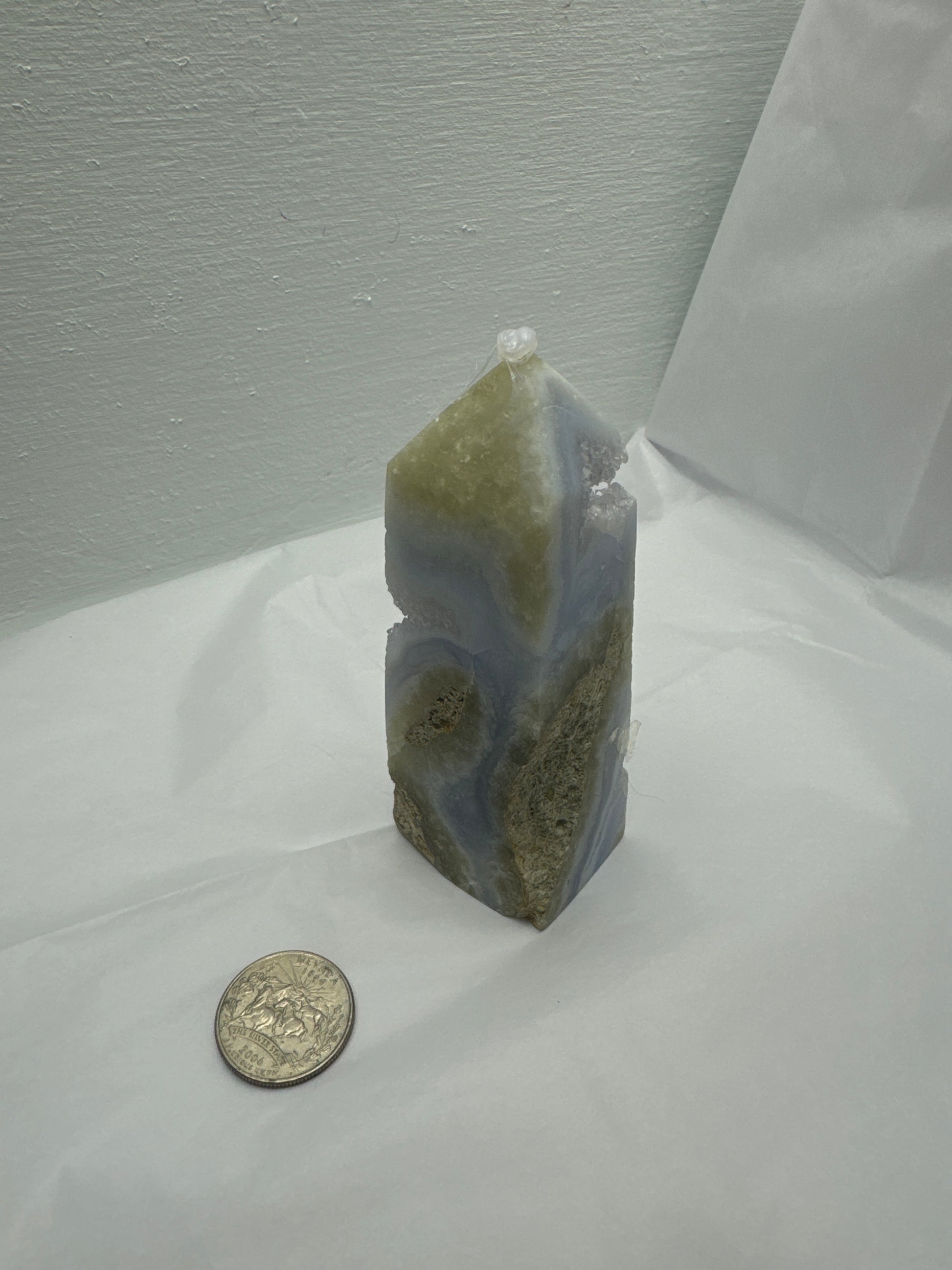 Step into a world of serenity and clear communication with our Blue Lace Agate Tower, a soothing crystal known for its gentle vibrations that promote calmness, emotional healing, and self-expression. This beautiful tower is ideal for those seeking peace, clarity, and a deeper connection with their inner voice.