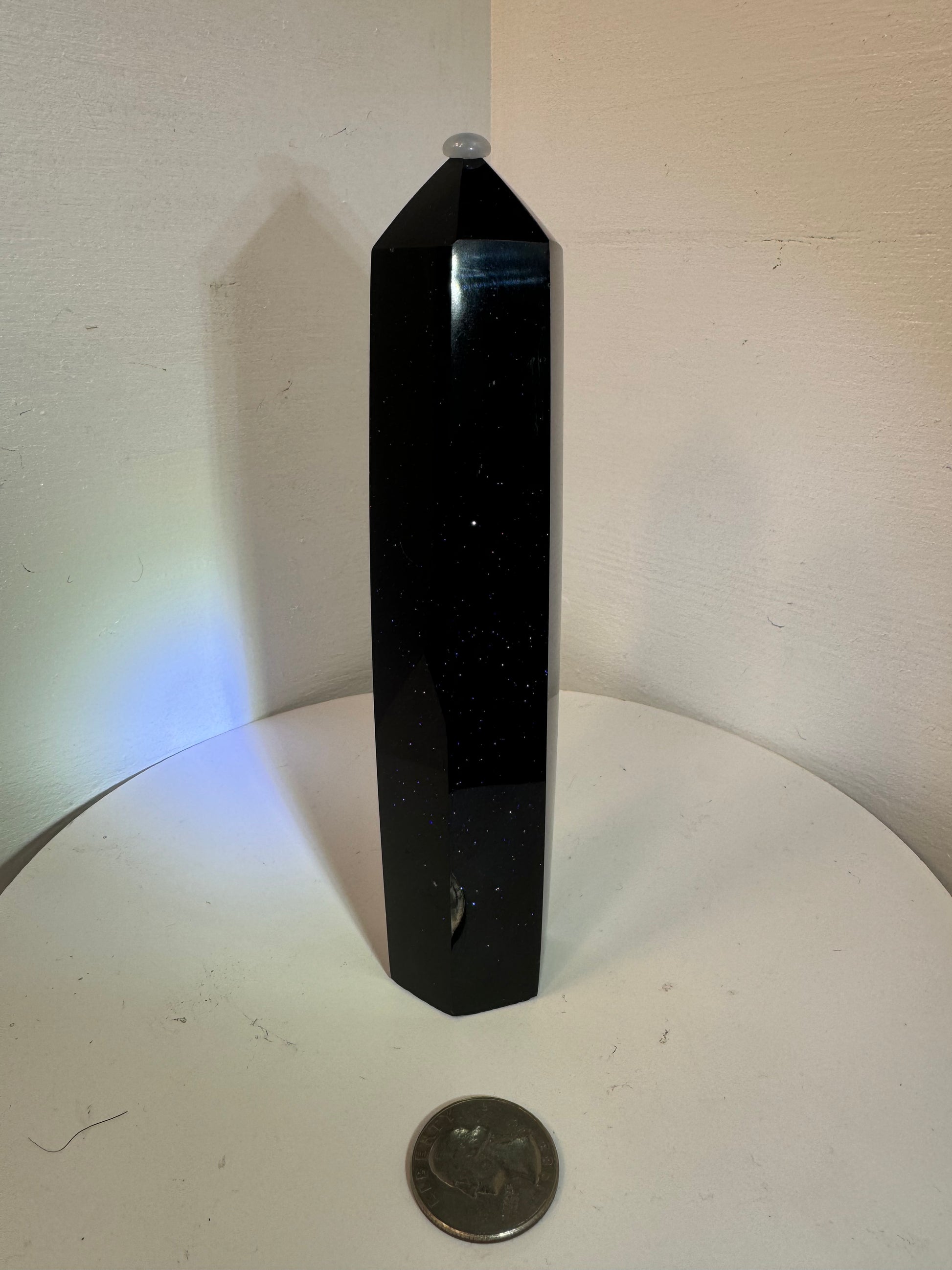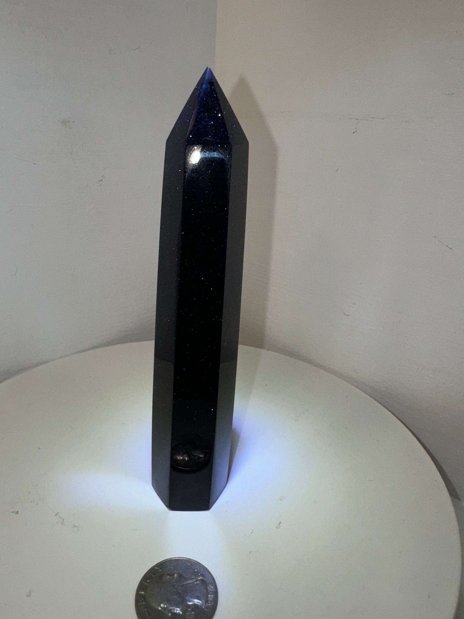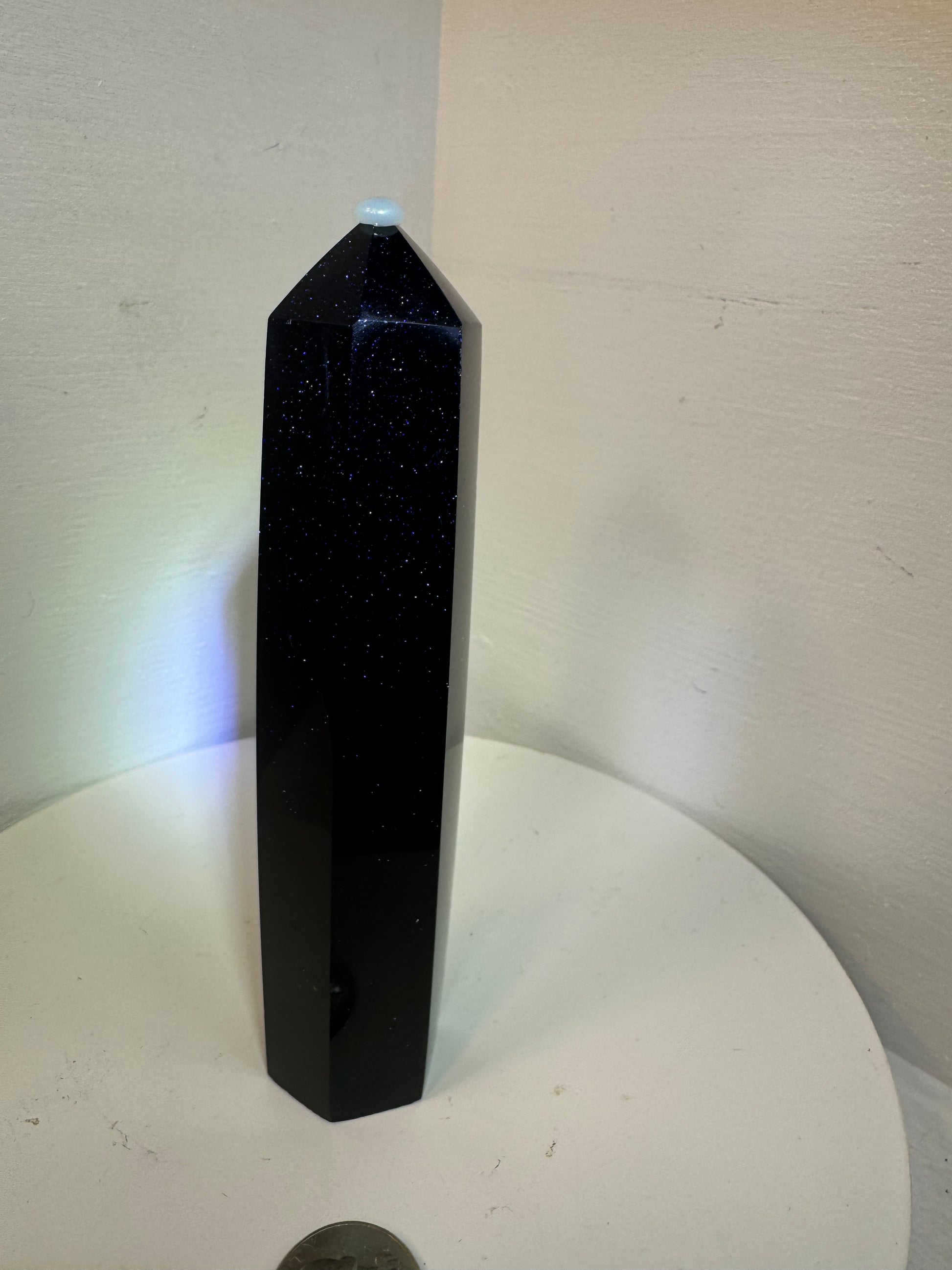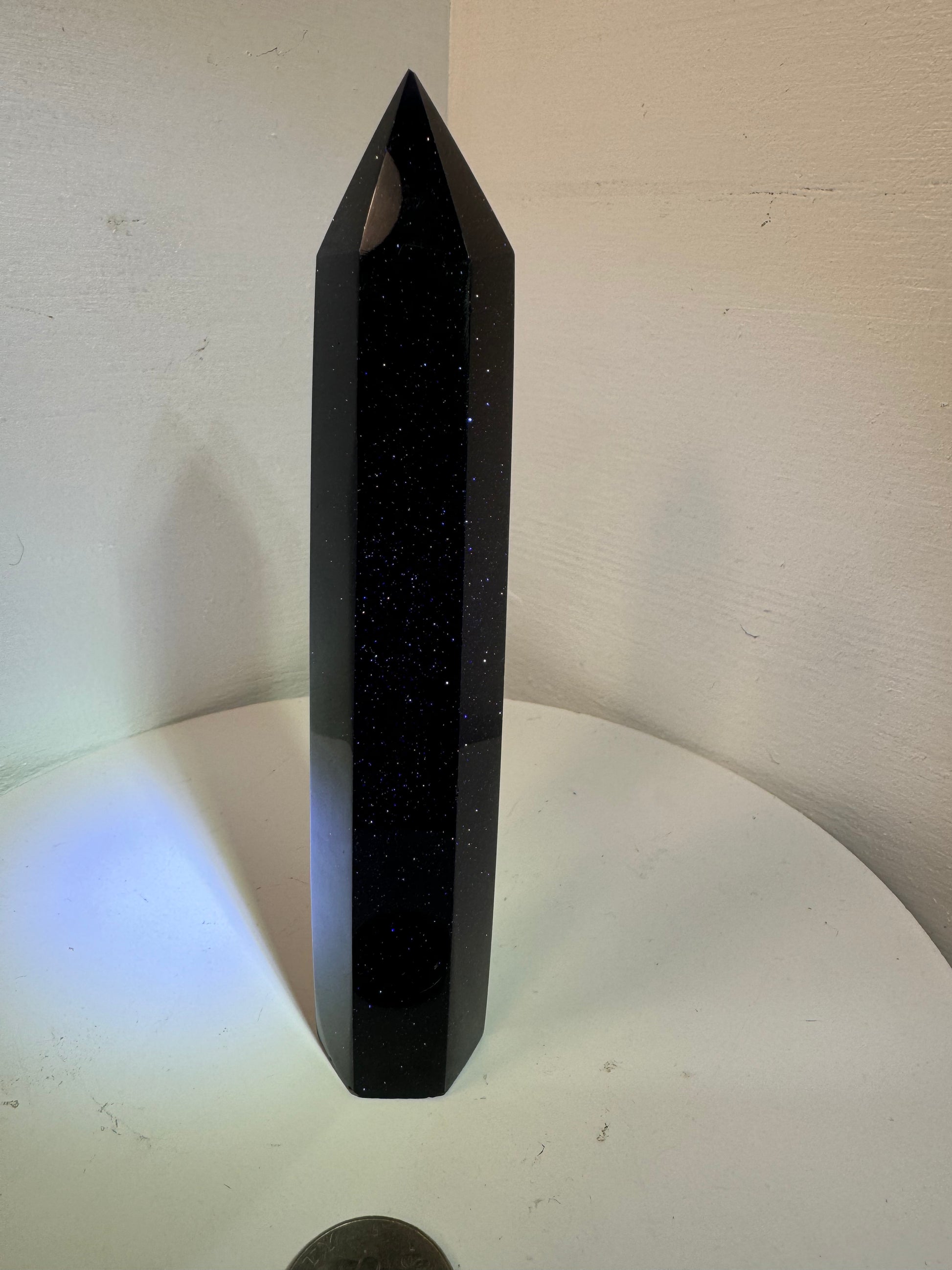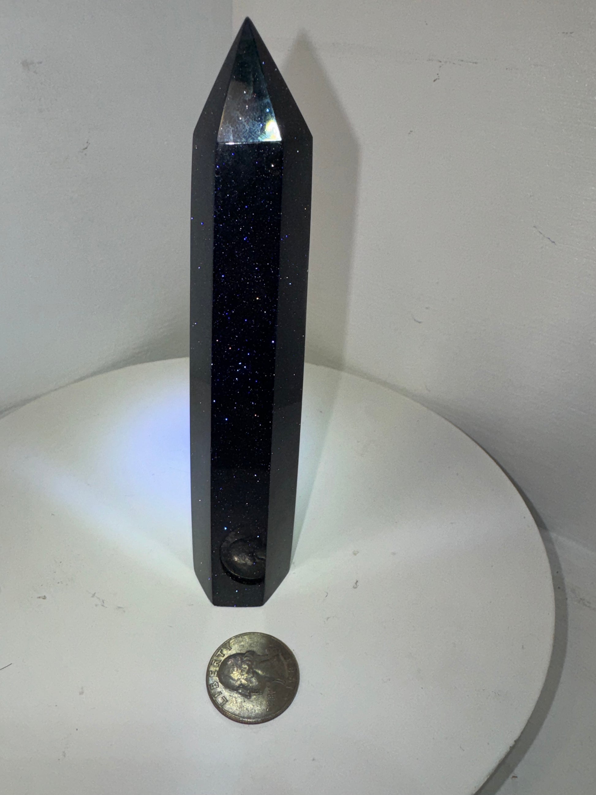 Each Blue Sandstone Tower is crafted from high-quality blue sandstone, showcasing a deep blue base with shimmering, star-like flecks. The polished tower design directs energy upward, amplifying its inspiring and empowering vibrations.