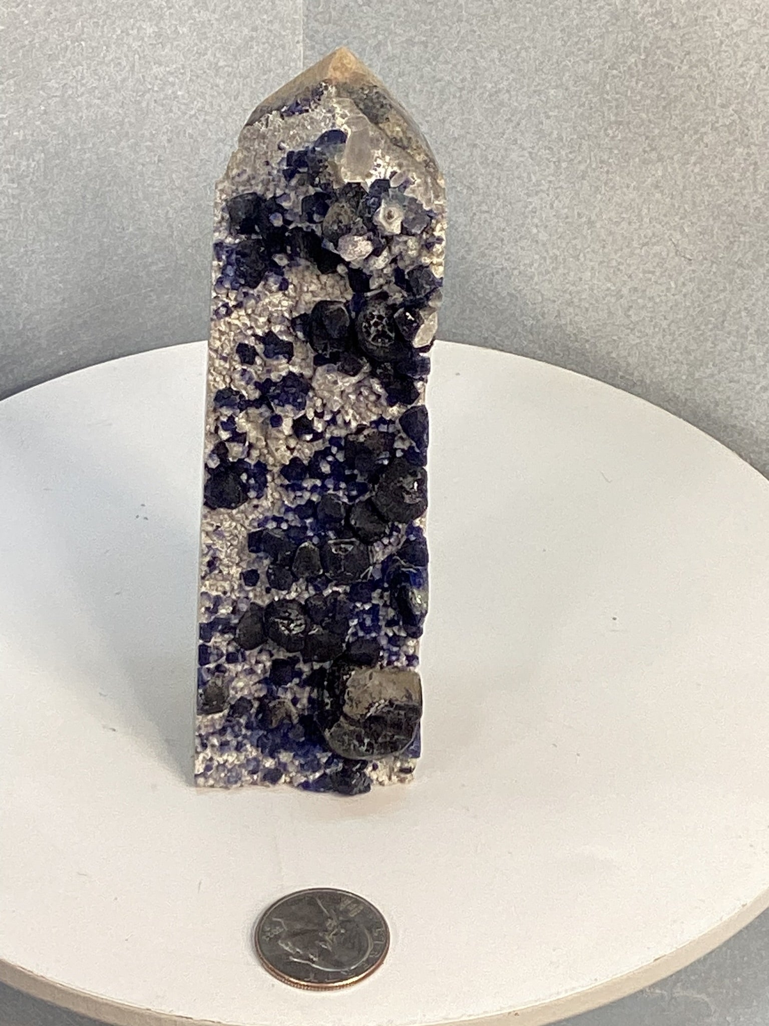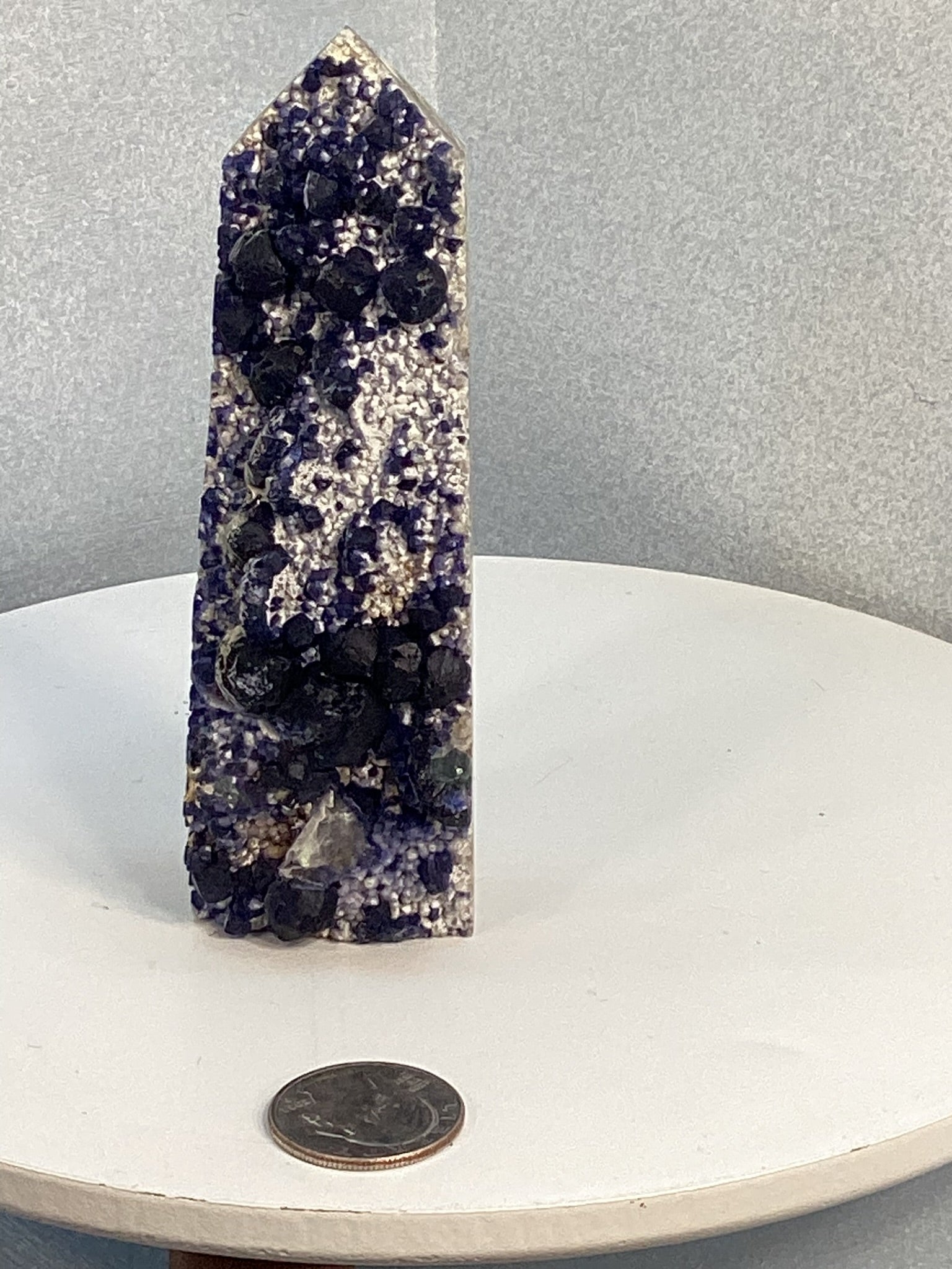 Each Blueberry Jasper Tower features a range of soothing blue hues with intricate natural patterns resembling clusters of berries. The polished point directs energy upward, making it a powerful tool for manifesting balance and clarity.