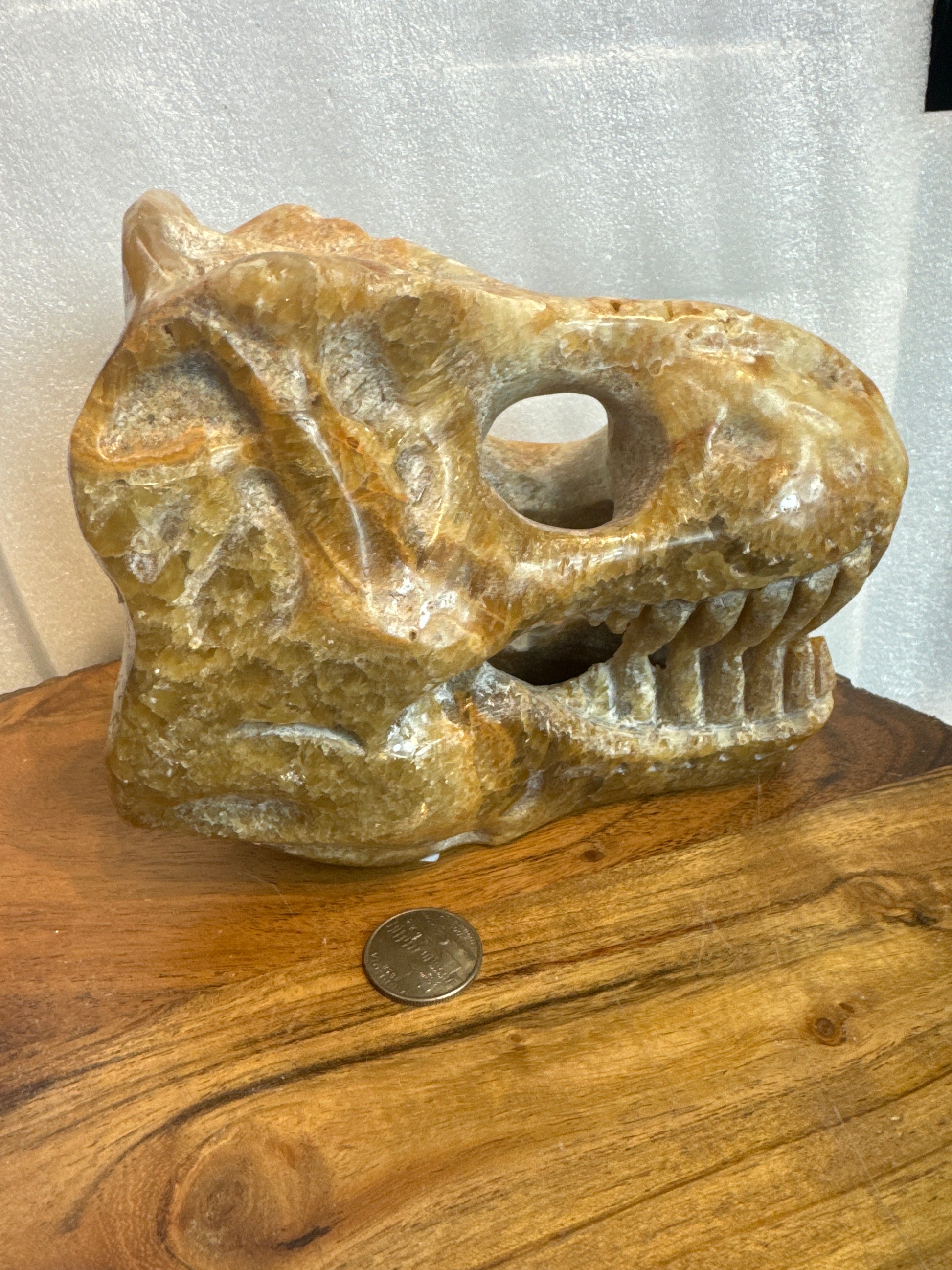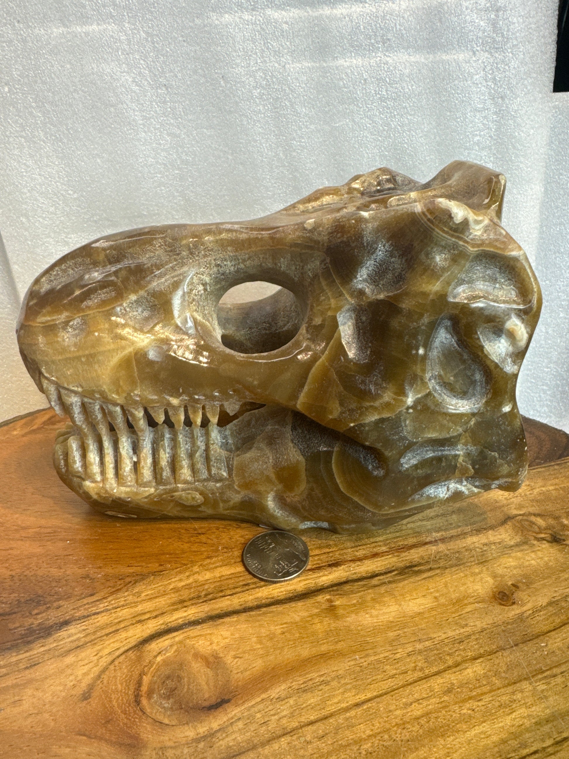 Unearth the ancient energy of our **Chocolate Agate Dinosaur Skull**, a captivating symbol of resilience, transformation, and connection to Earth’s history. This intricately carved piece combines the grounding properties of chocolate agate with the fierce strength of a dinosaur, making it perfect for fostering courage, balance, and personal growth.