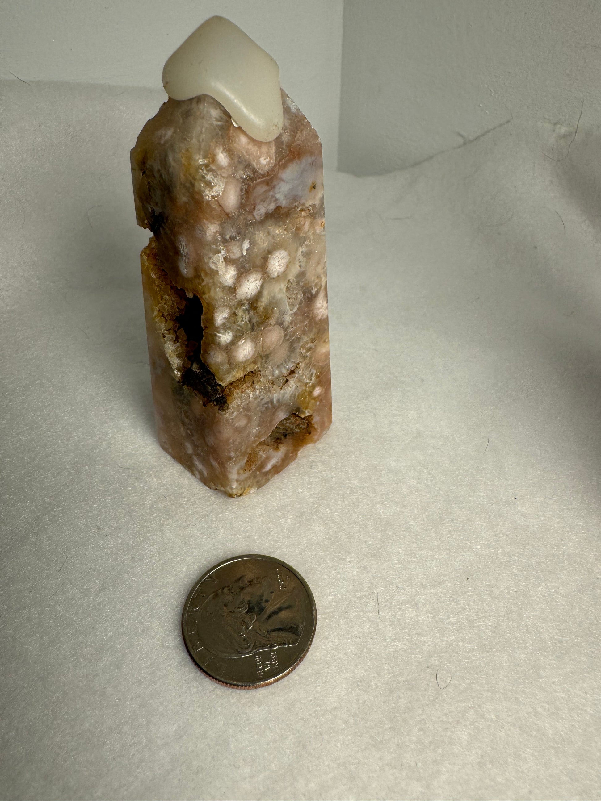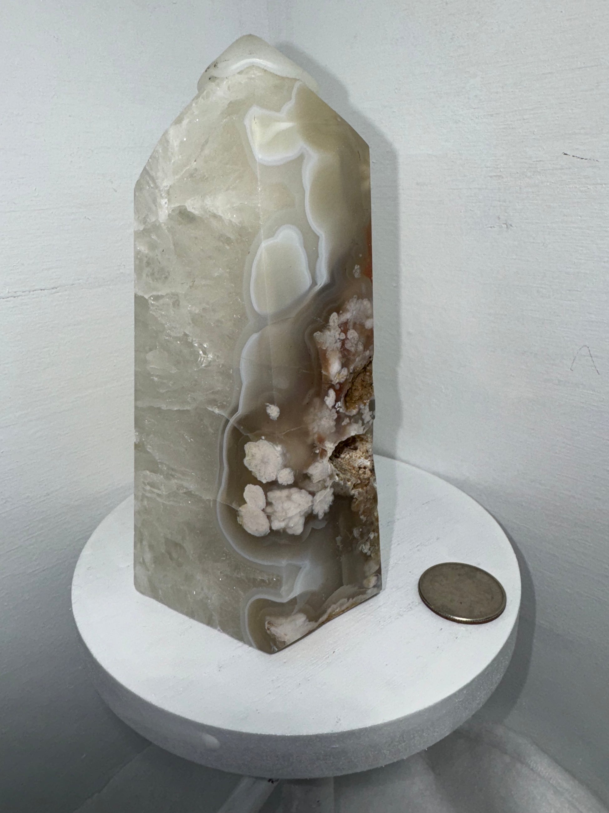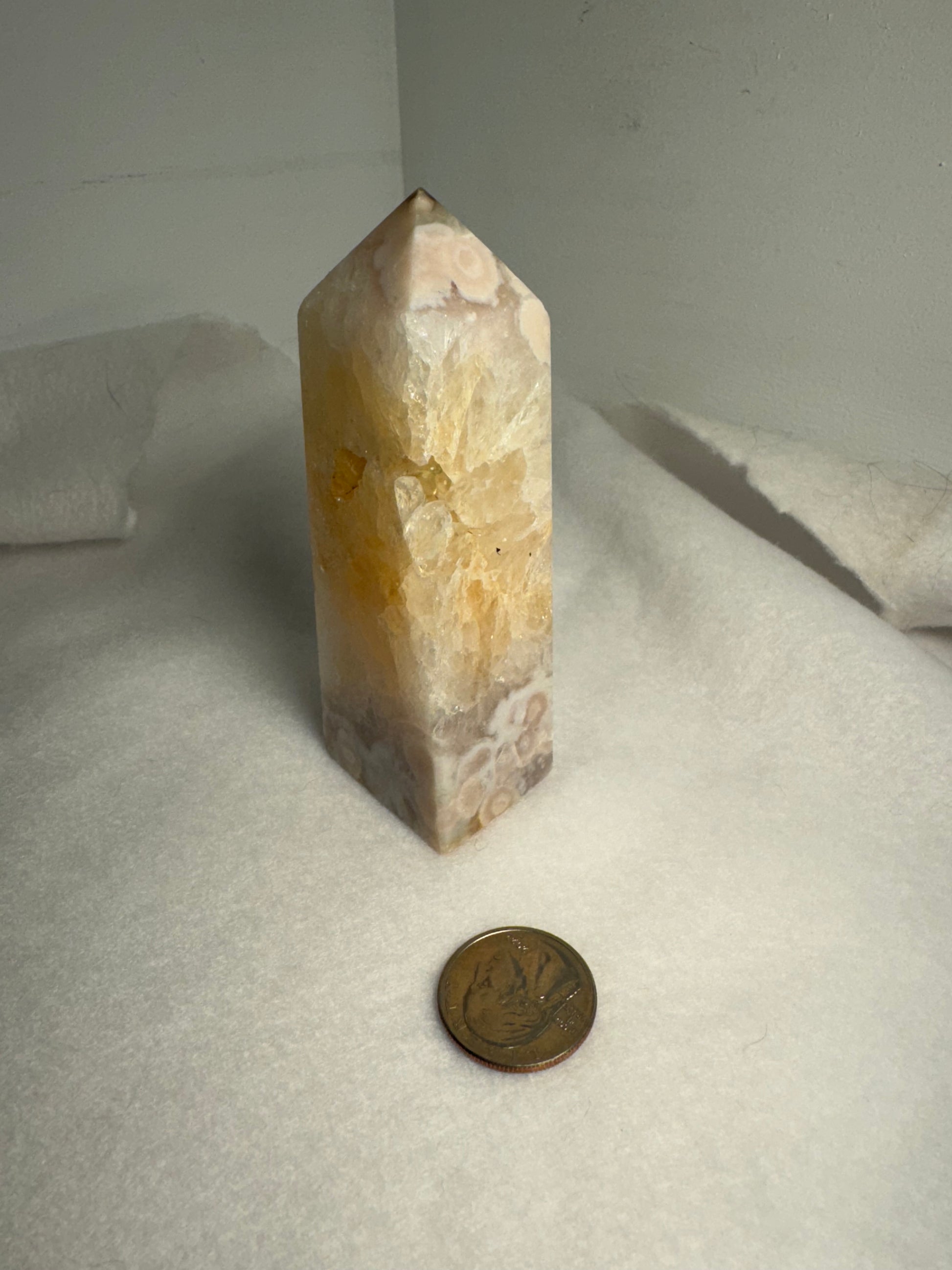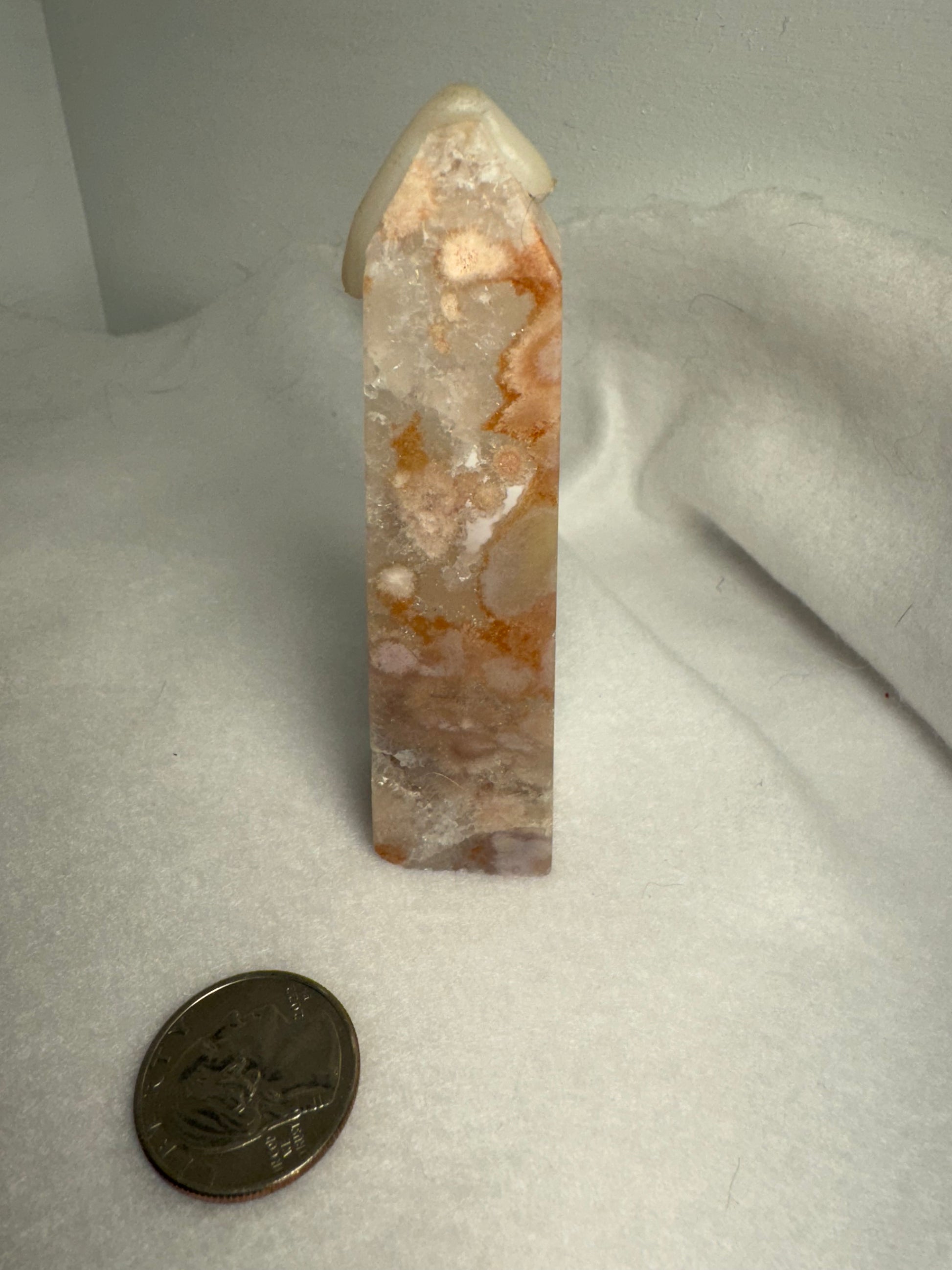 Handcrafted from natural Flower Agate crystal, each tower showcases unique patterns and hues of soft pink and white, reminiscent of delicate petals in bloom. Celebrate the sacred elegance and profound energy of your Flower Agate tower as you immerse yourself in its nurturing embrace.