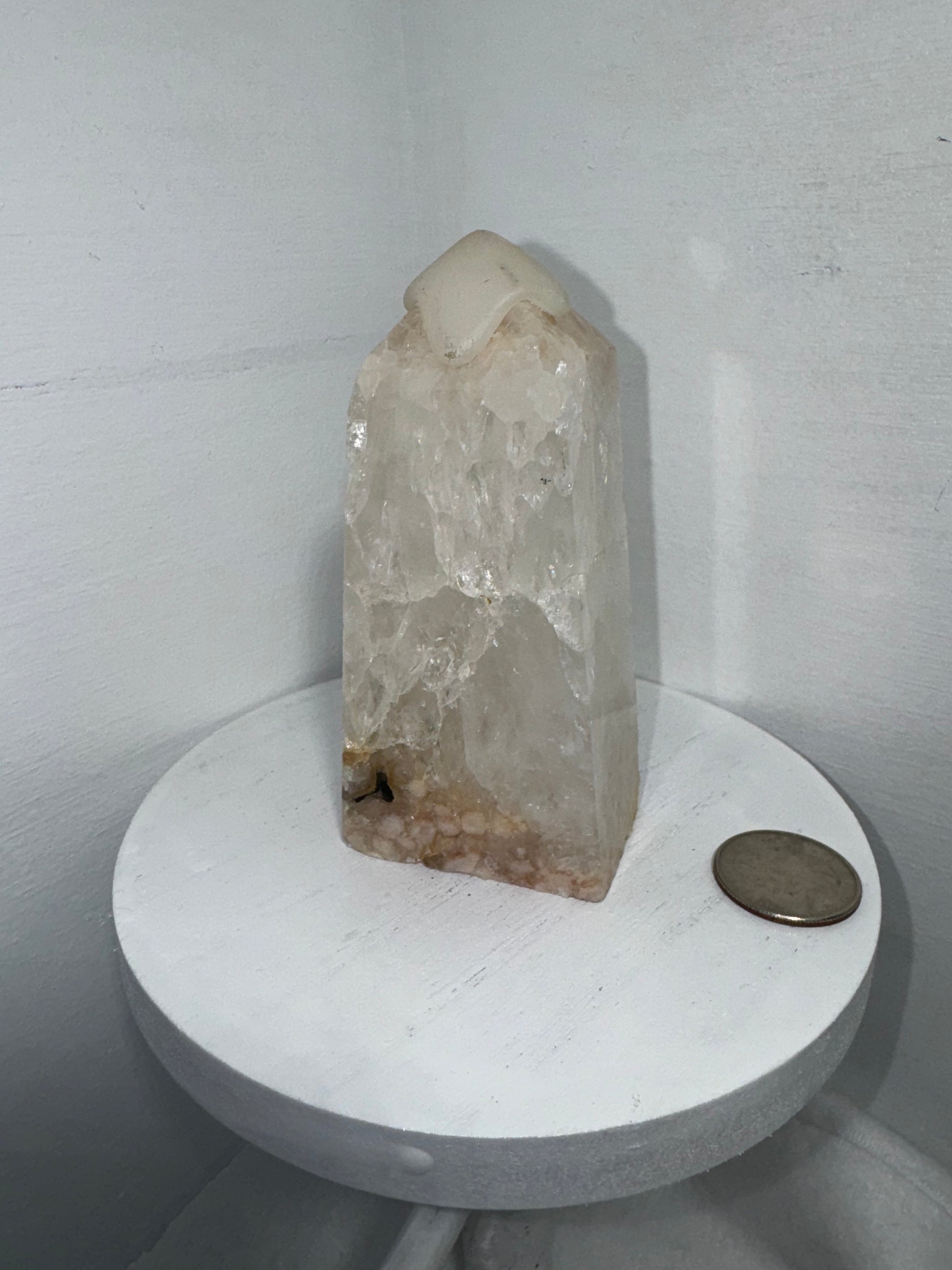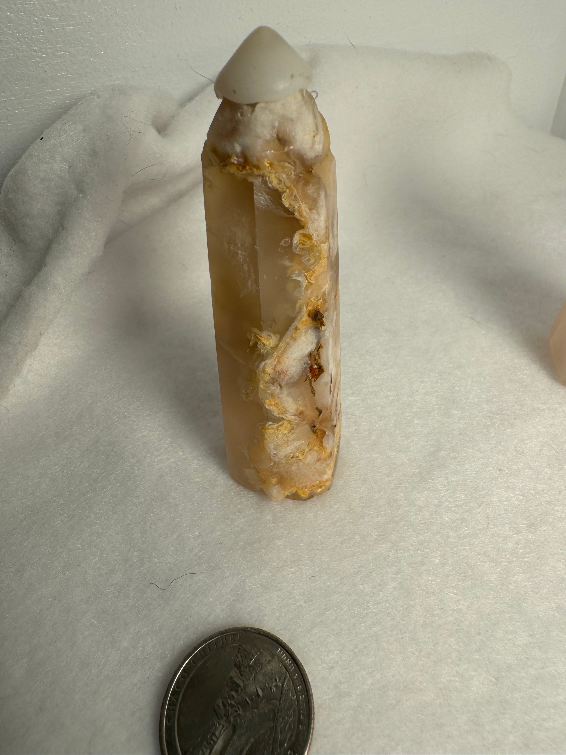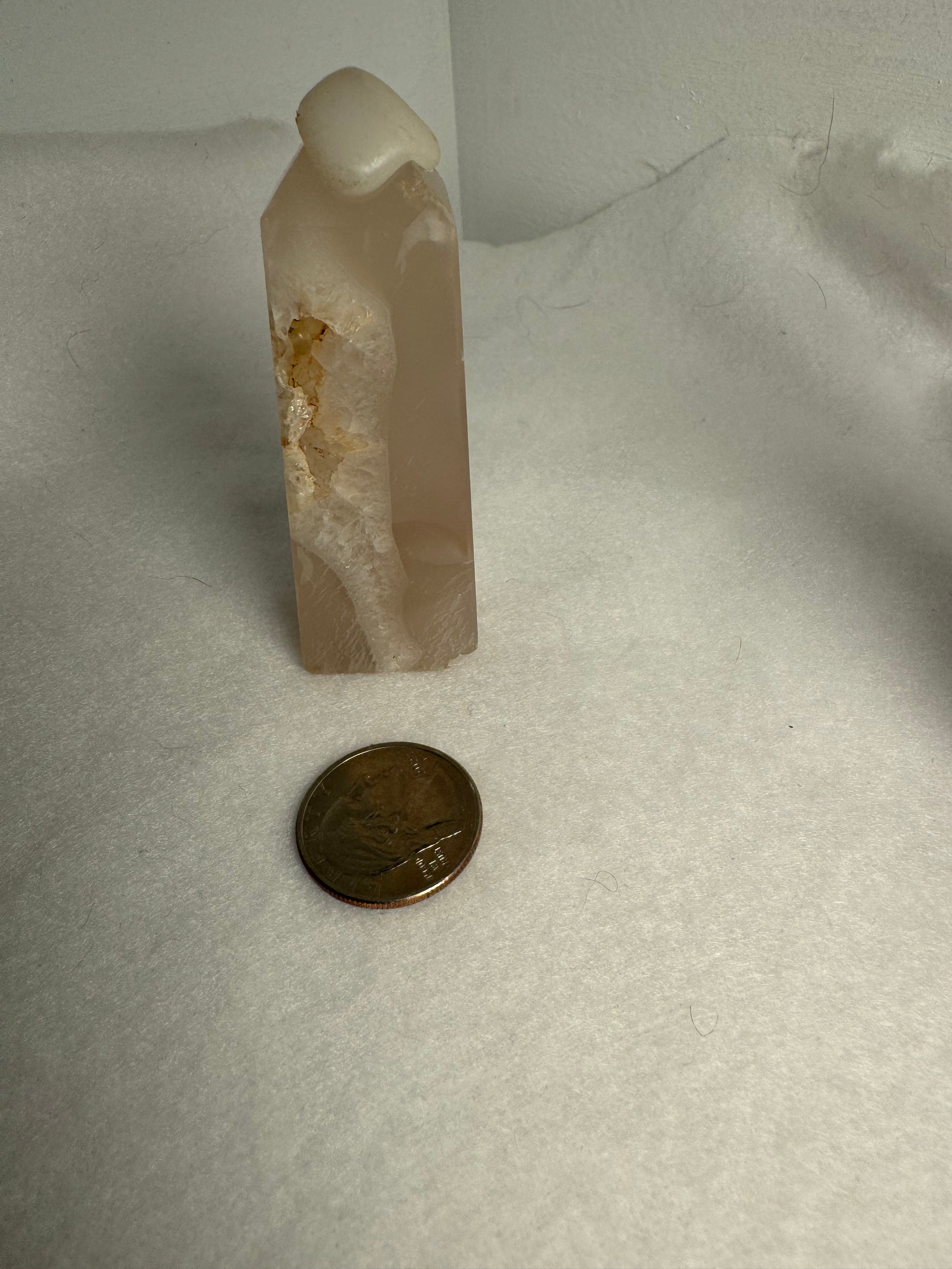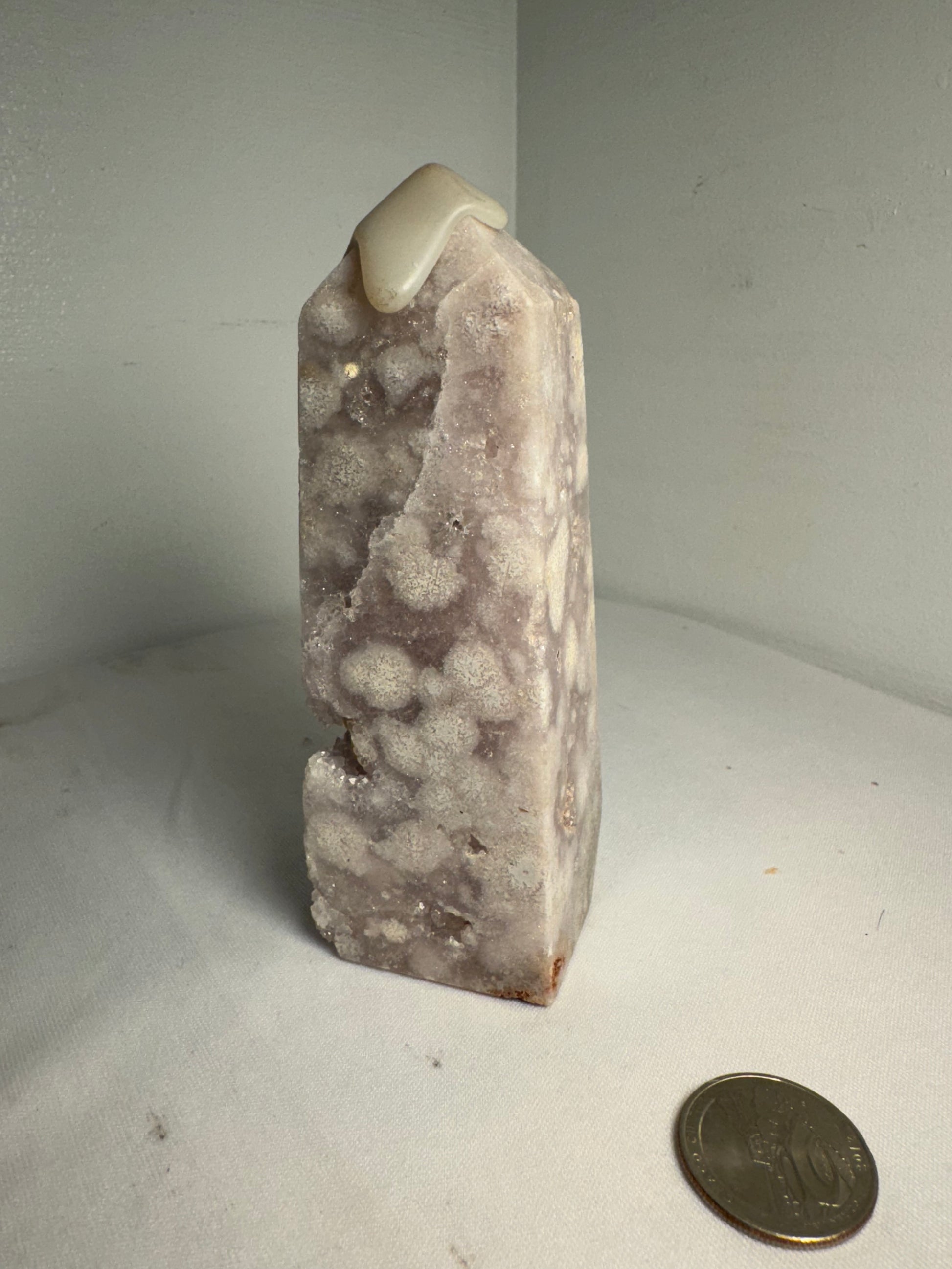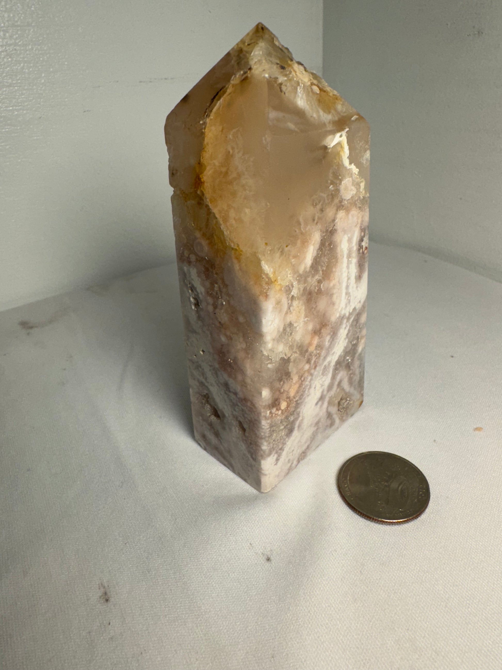 Handcrafted from natural Flower Agate crystal, each tower showcases unique patterns and hues of soft pink and white, reminiscent of delicate petals in bloom. Celebrate the sacred elegance and profound energy of your Flower Agate tower as you immerse yourself in its nurturing embrace.
