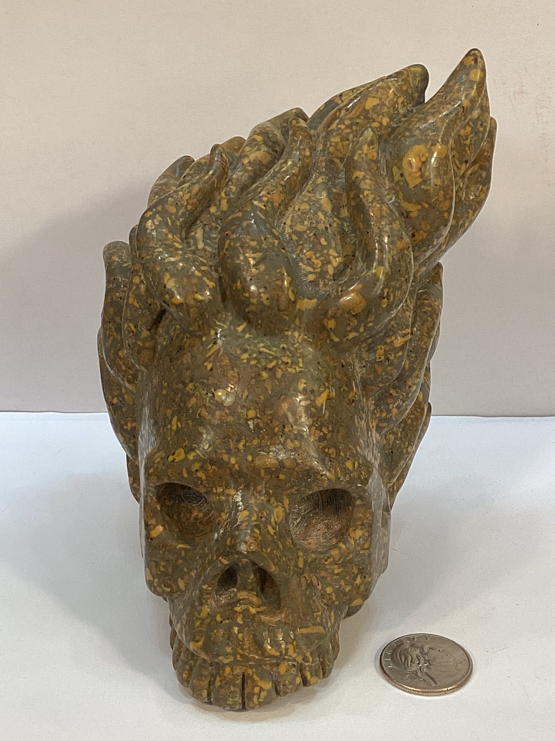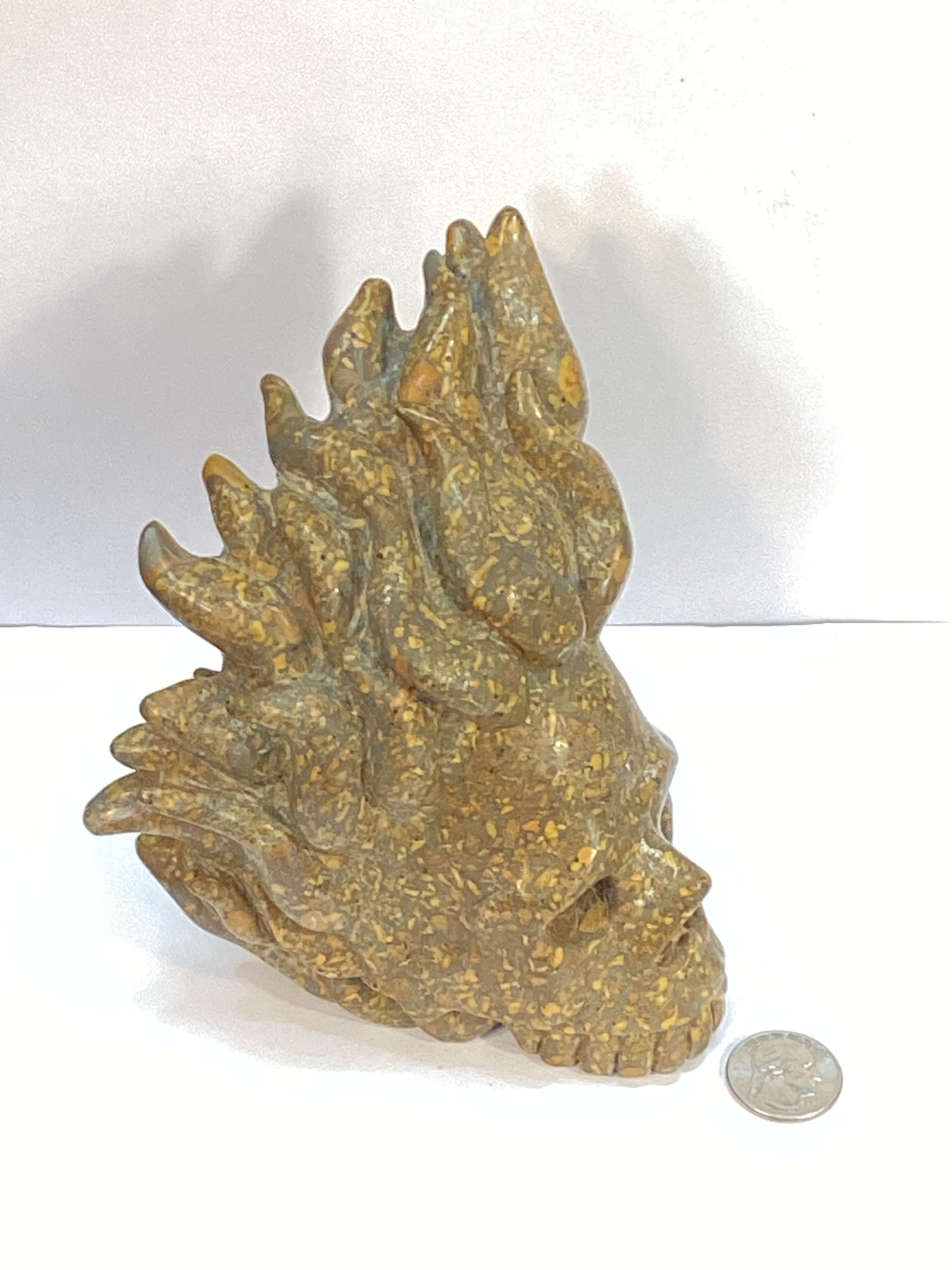Each carving features intricate flame details that give the skull a dynamic and fiery appearance. The material used—whether obsidian, carnelian, or other vibrant stones—enhances the intense energy of the piece, making it a standout addition to any collection.