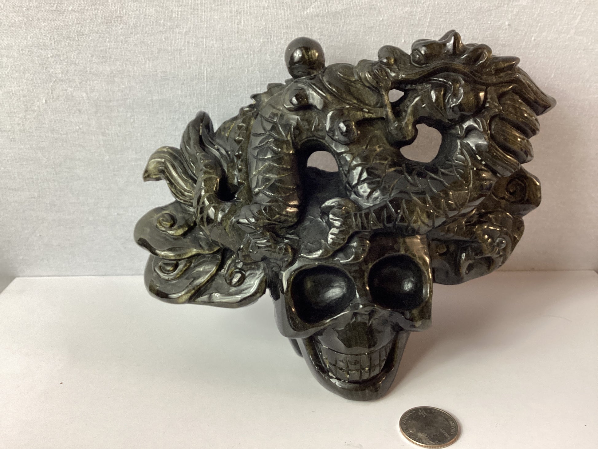 GOLDEN OBSIDIAN SKULL WITH DRAGON HEADPIECE-Power, Wisdom, and Protection