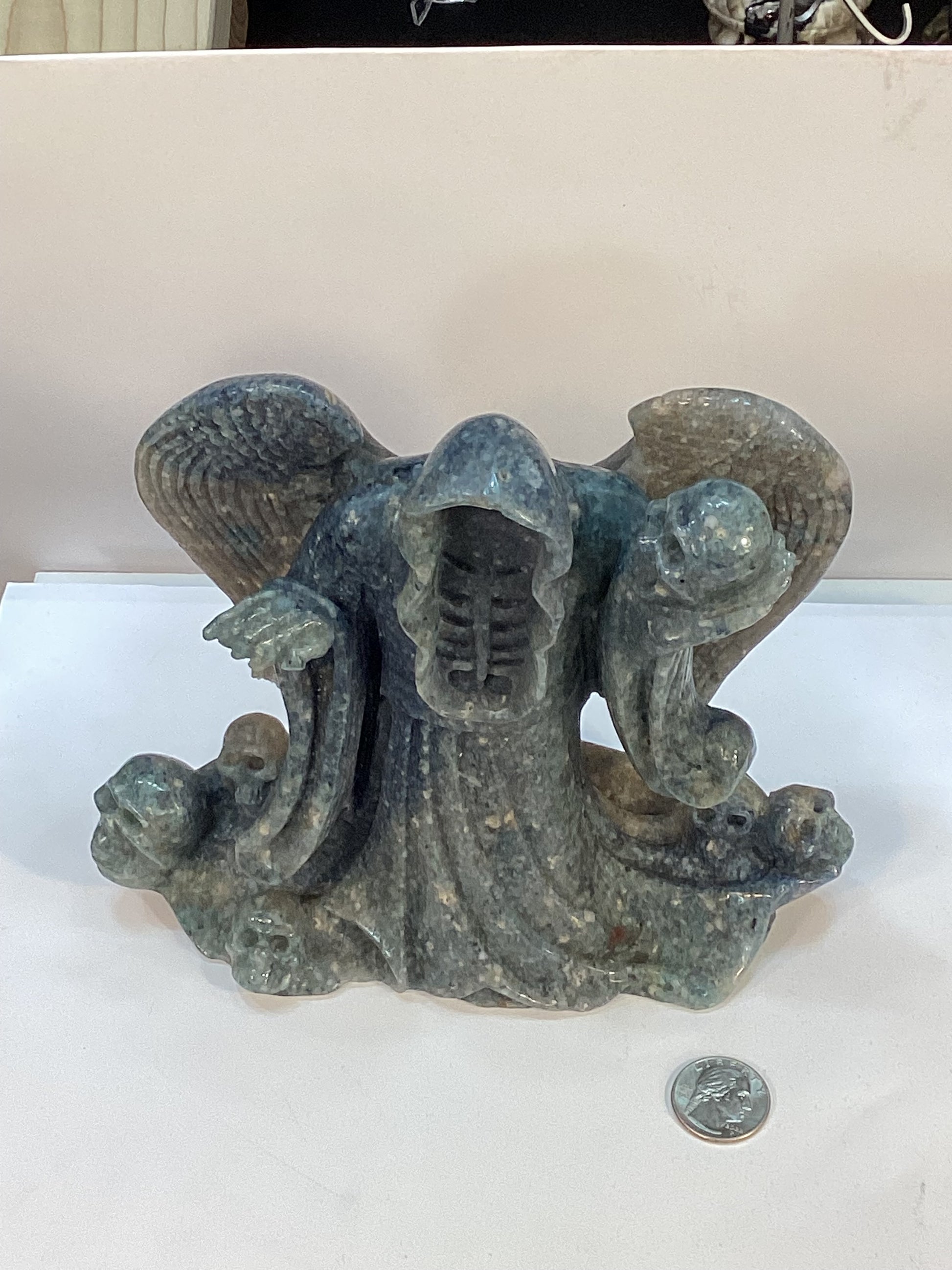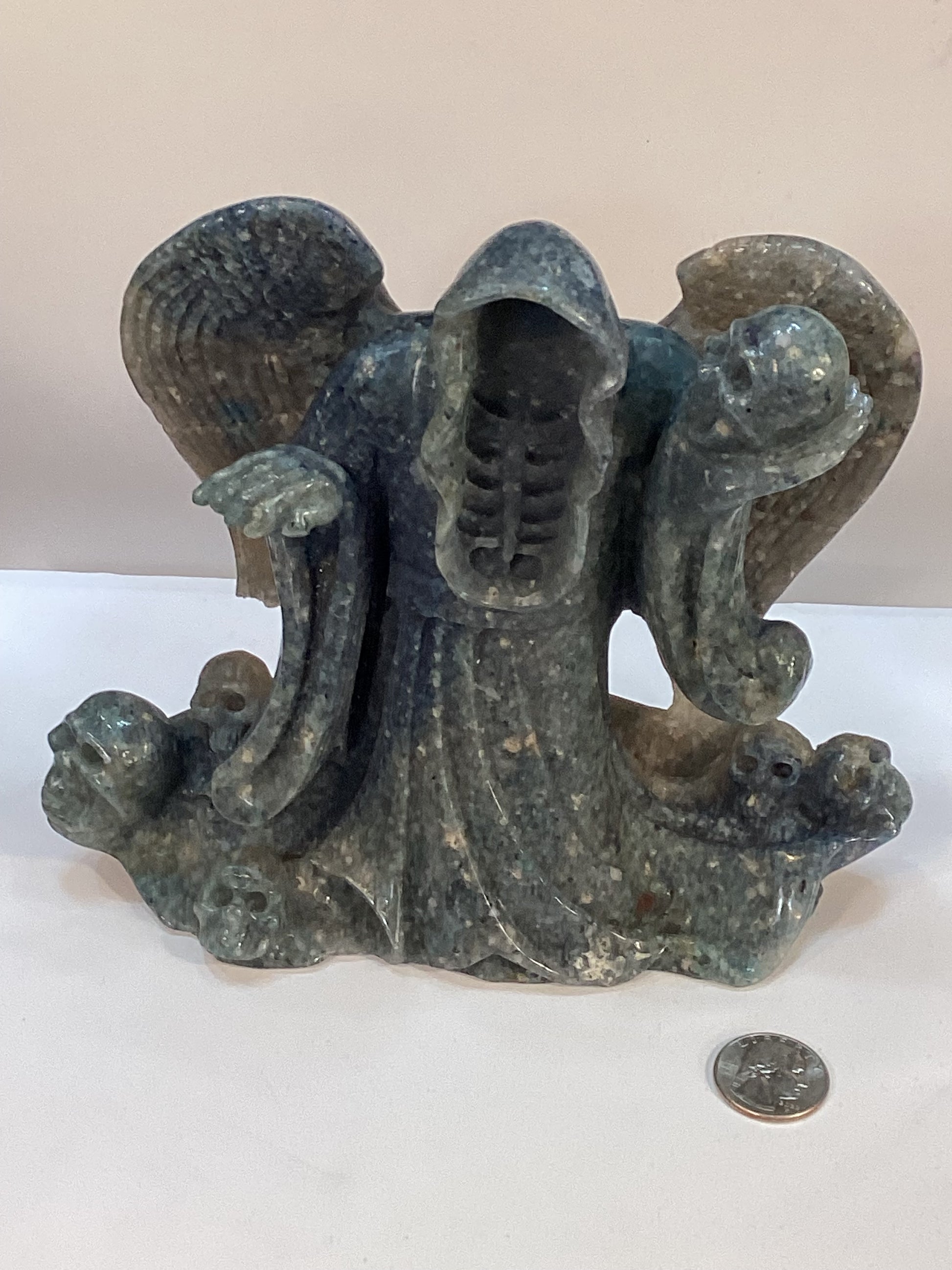 Each K2 Grim Reaper is skillfully carved, showcasing the stone’s natural speckled gray and vibrant blue orbs. The fine details of the Grim Reaper—its hooded cloak and scythe—capture its mysterious, transformative essence, making it a hauntingly beautiful piece.