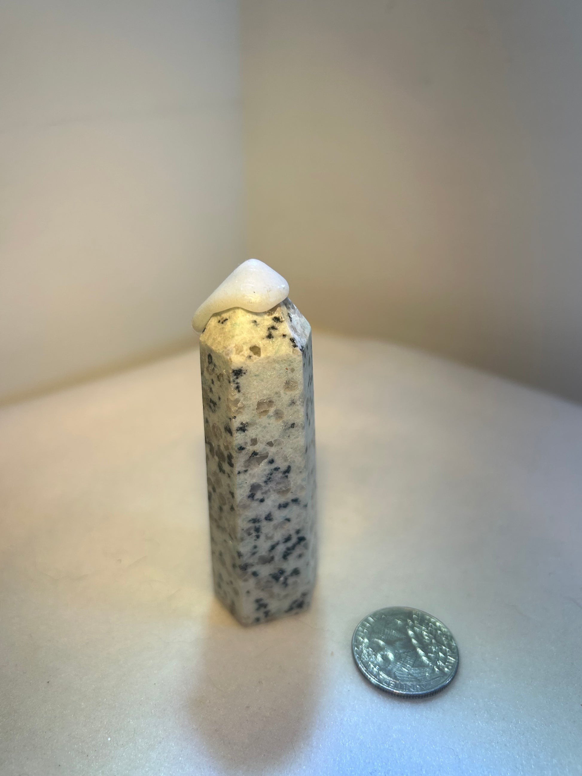 Each Kiwi Jasper Tower features a blend of calming pastel greens, whites, and black speckles, reminiscent of tranquil natural landscapes. Its smooth, polished surface and elegant shape make it an ideal addition to any crystal collection or sacred space.