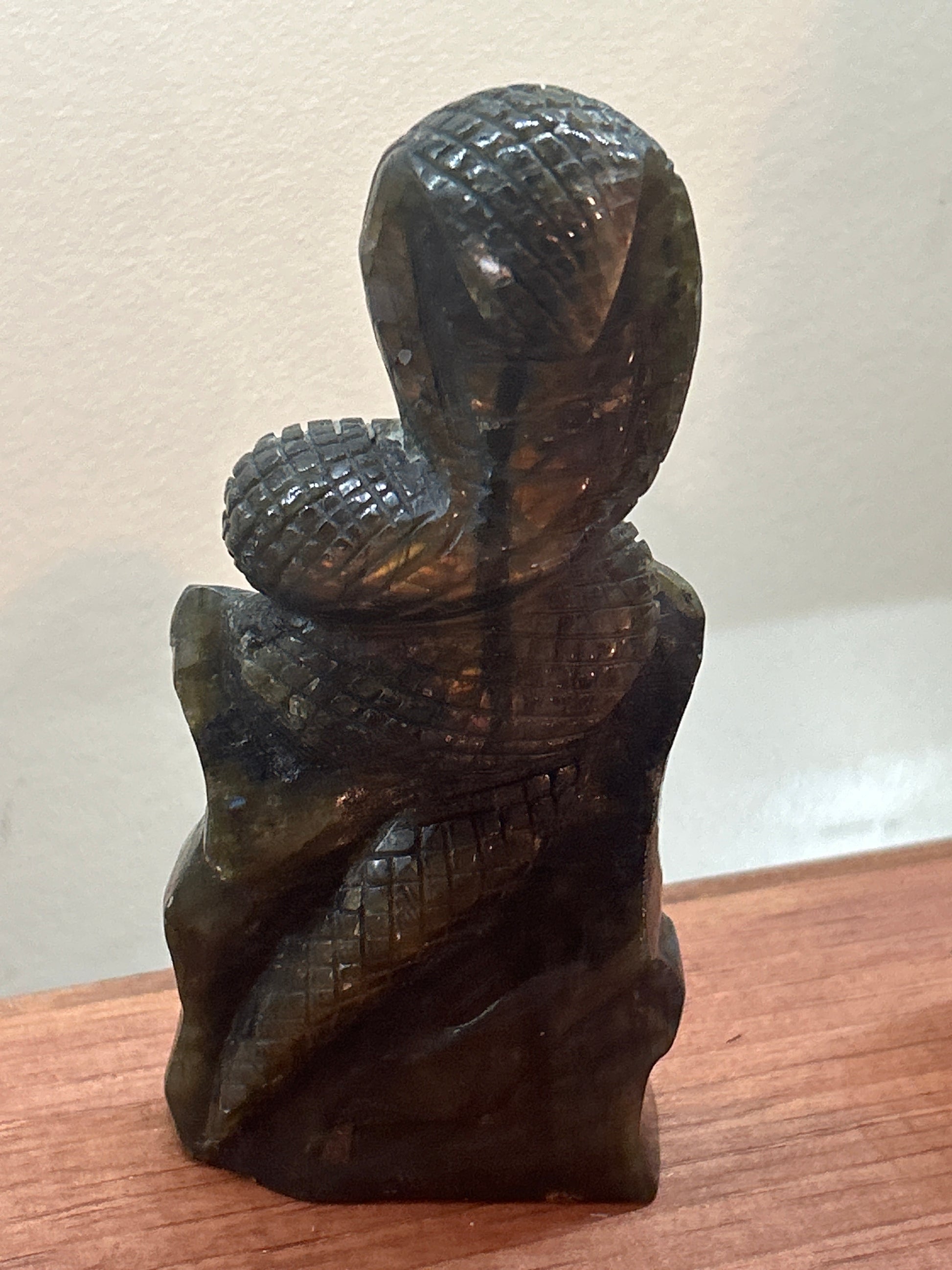 • Transformation and Empowerment: Labradorite is often called the “Stone of Transformation,” helping you embrace change with confidence and adaptability. The cobra, symbolizing rebirth and shedding old layers, enhances this energy, guiding you through personal growth with resilience.