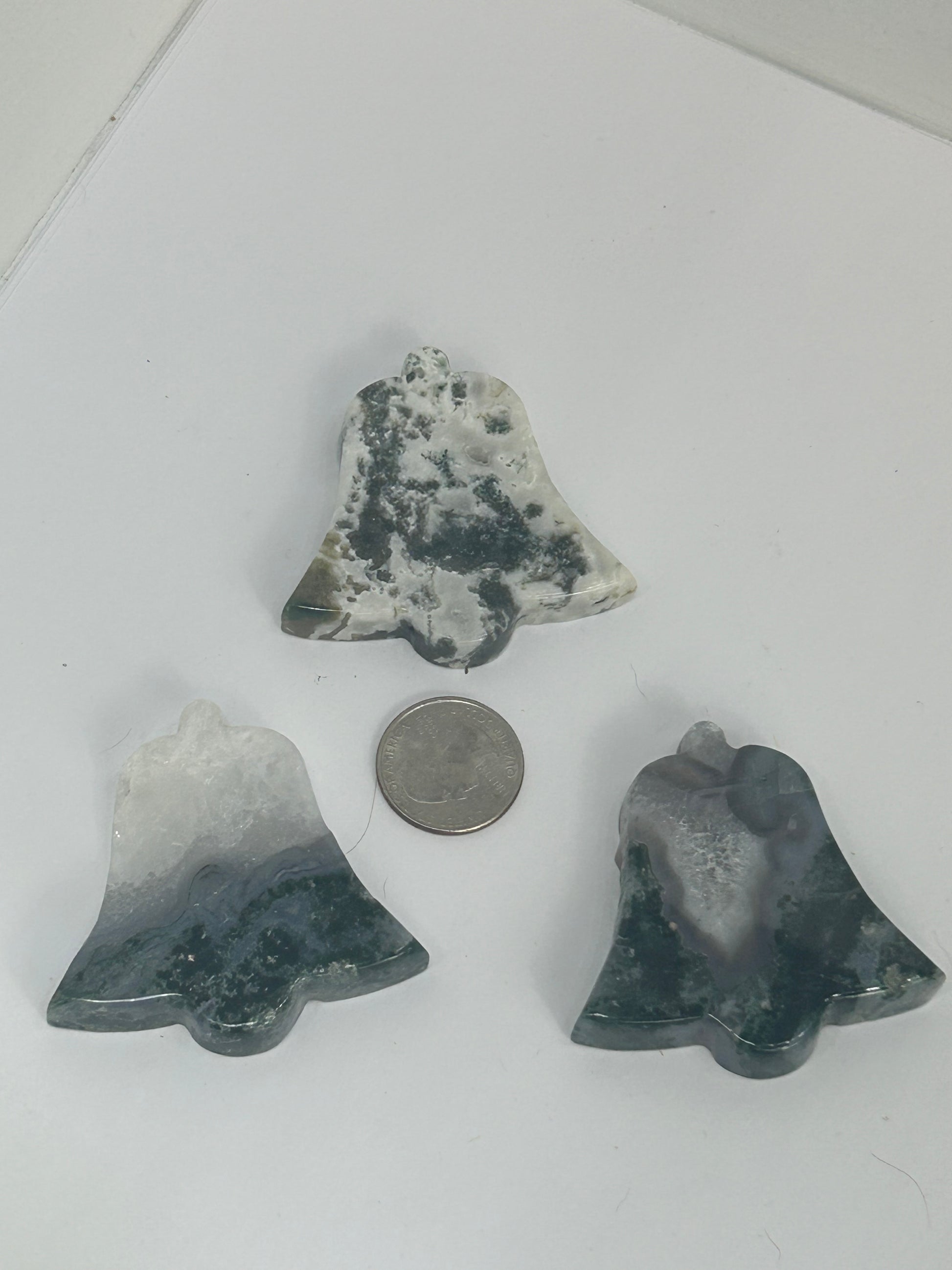 Each Moss Agate Bell features intricate carvings and lush green hues interwoven with natural inclusions that resemble mossy landscapes. The polished finish highlights its unique patterns, creating a visually stunning and energetically uplifting piece.