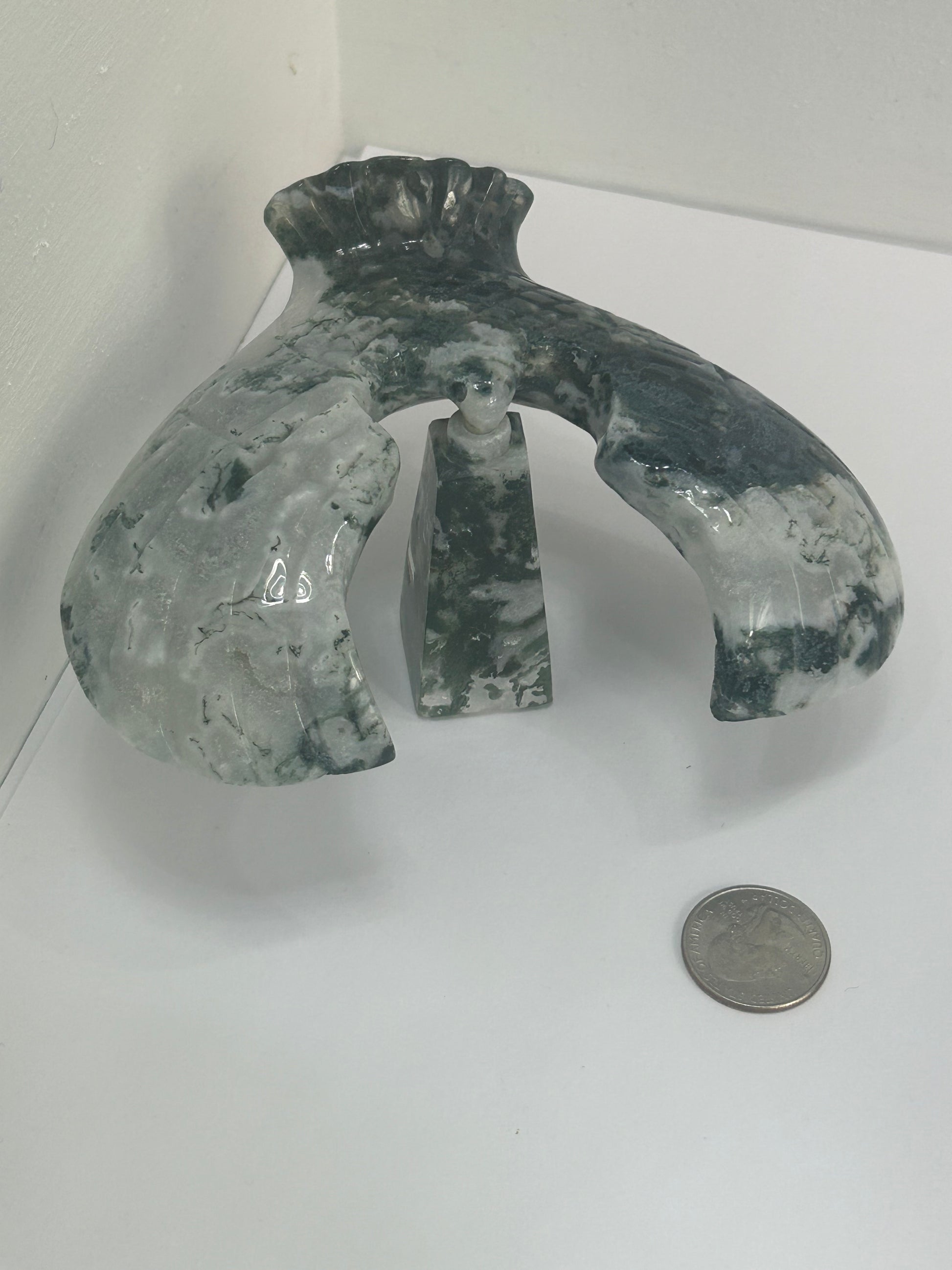 Experience the tranquil beauty and soothing energy of our Moss Agate Spinning Bird with Base, a unique creation that symbolizes freedom, resilience, and connection to nature. The spinning feature adds an interactive element, making it a calming and mesmerizing piece for your space.