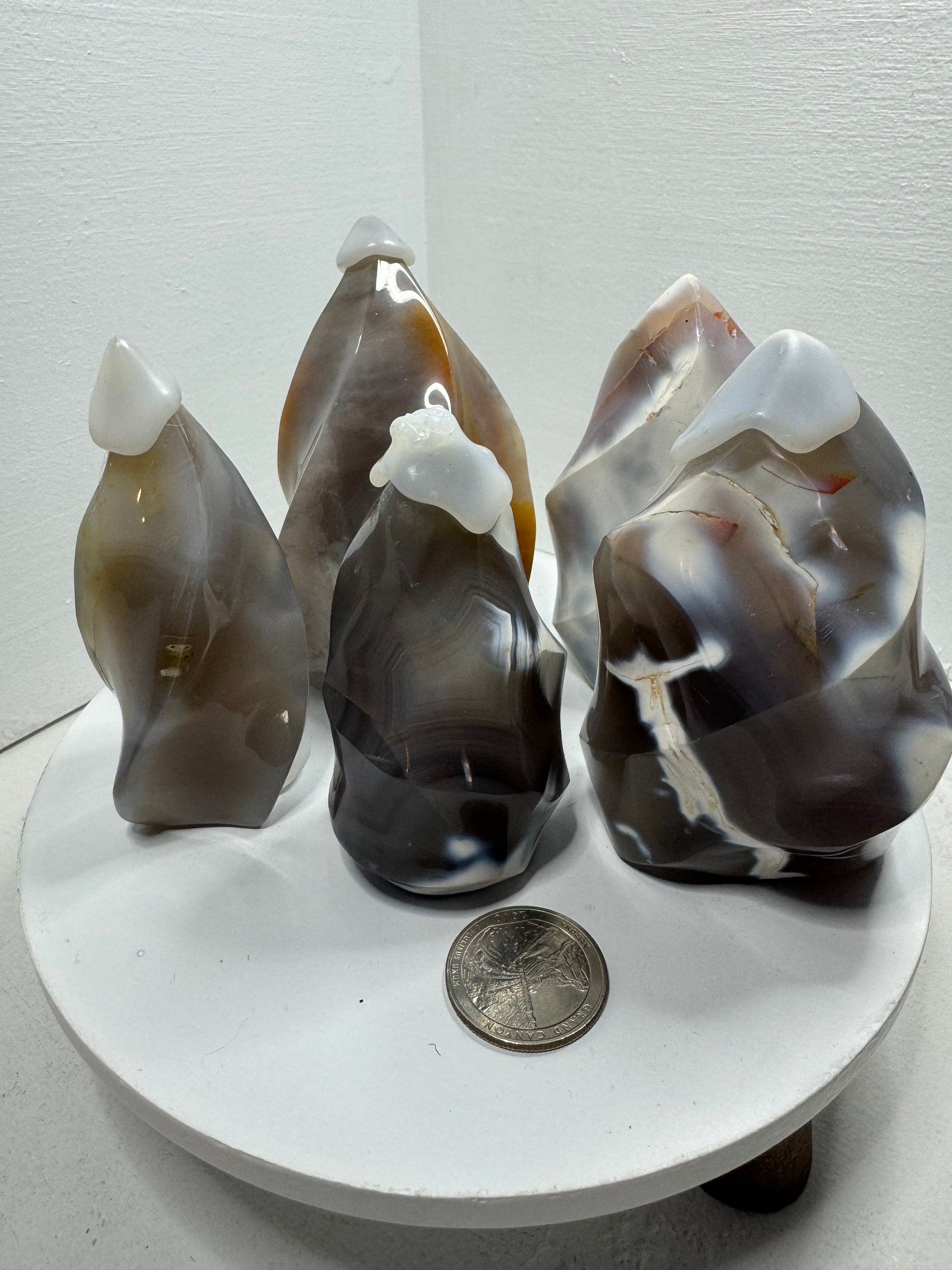 Handcrafted from natural Orca Agate crystal, each flame showcases unique patterns and hues of black, white, and grey, reminiscent of the sleek beauty of orca whales gliding through the ocean depths. Celebrate the sacred elegance and profound energy of your Orca Agate Flame as you immerse yourself in its protective embrace.