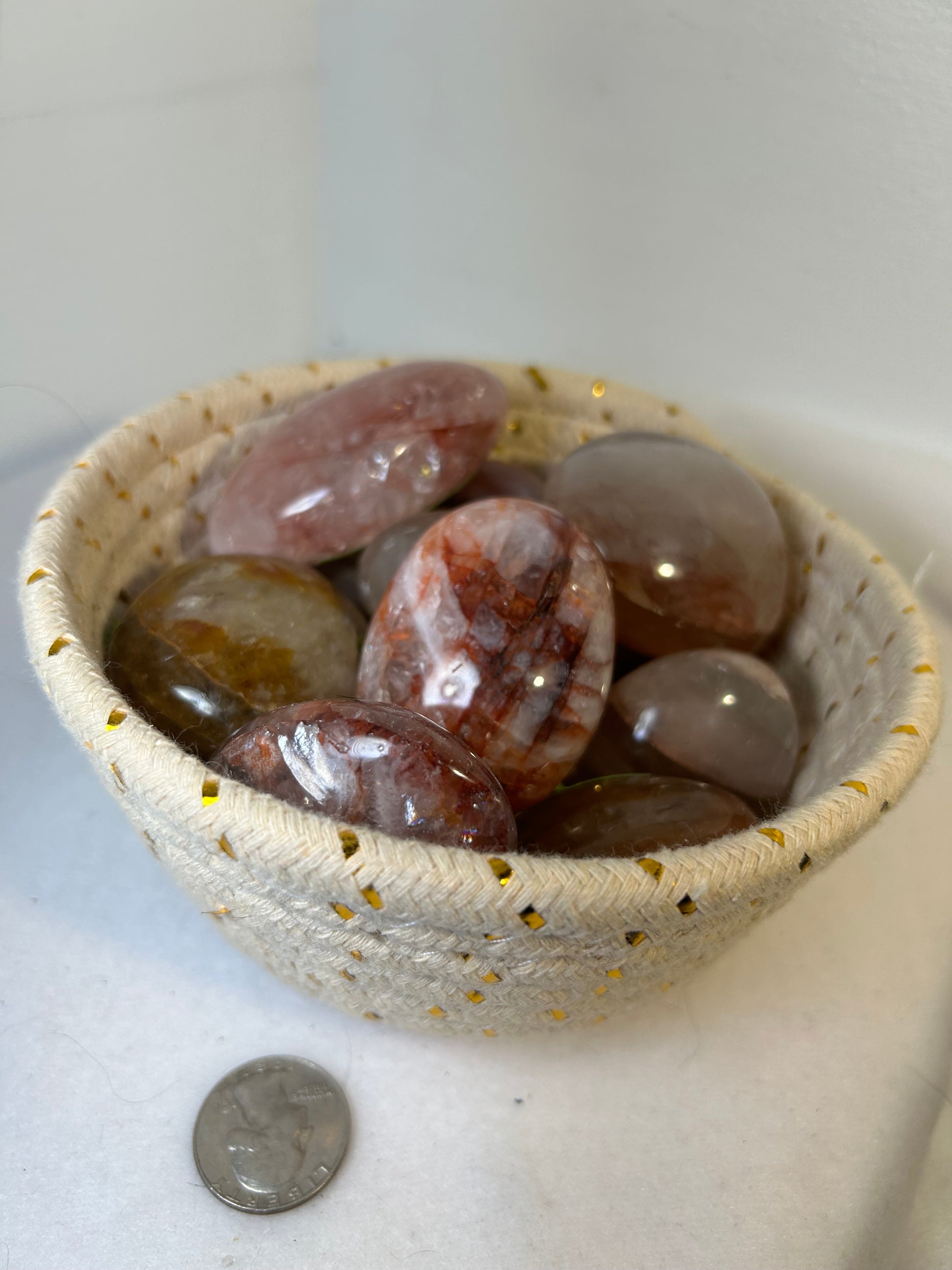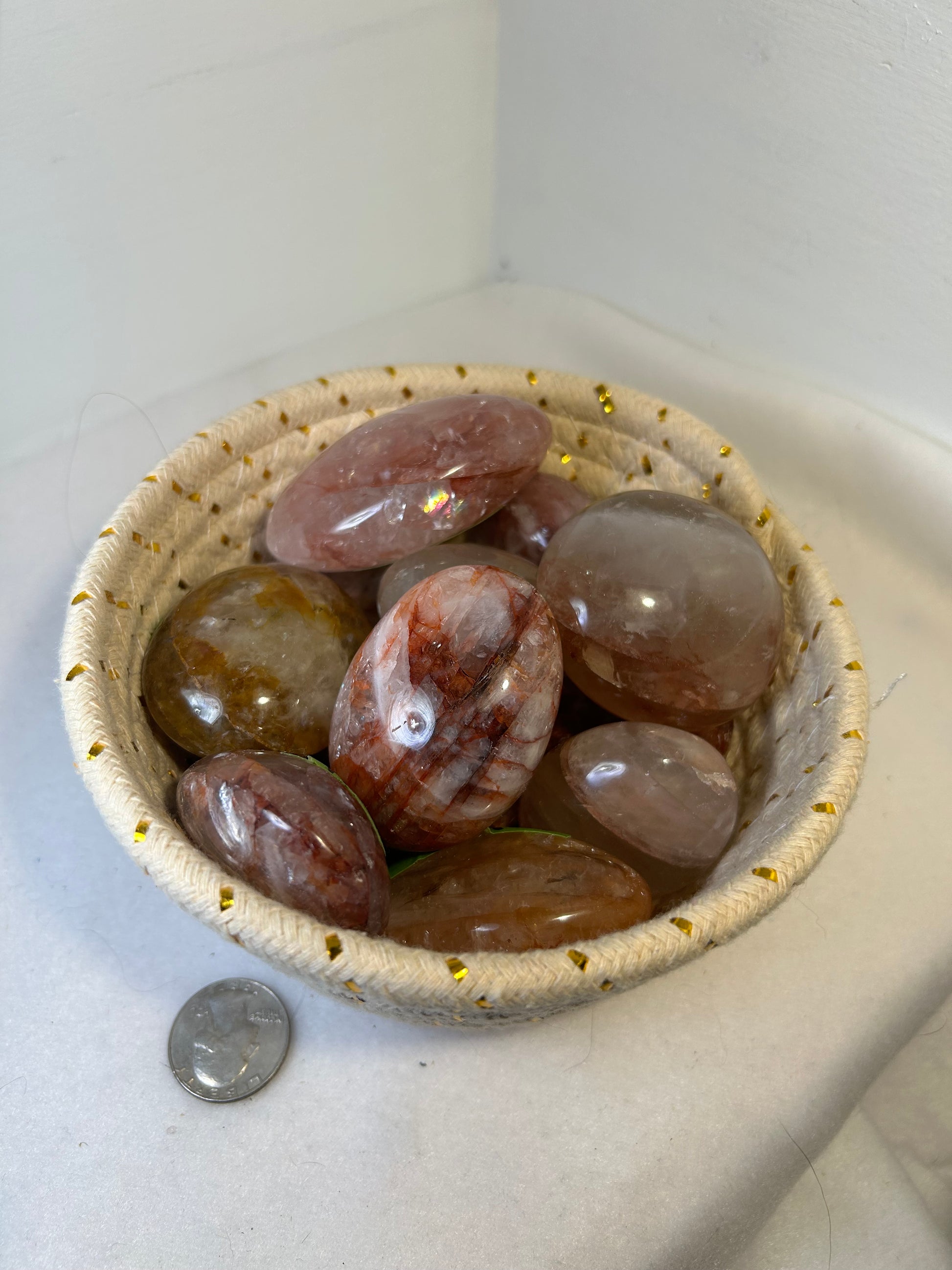 Experience the unique beauty and energy of our Fire Quartz palm stone. Each piece is carefully hand-polished to a smooth finish, perfectly sized to fit in the palm of your hand. With its captivating blend of clear quartz and hematite inclusions, Fire Quartz radiates a warm, vibrant energy, making it a stunning addition to any crystal collection.