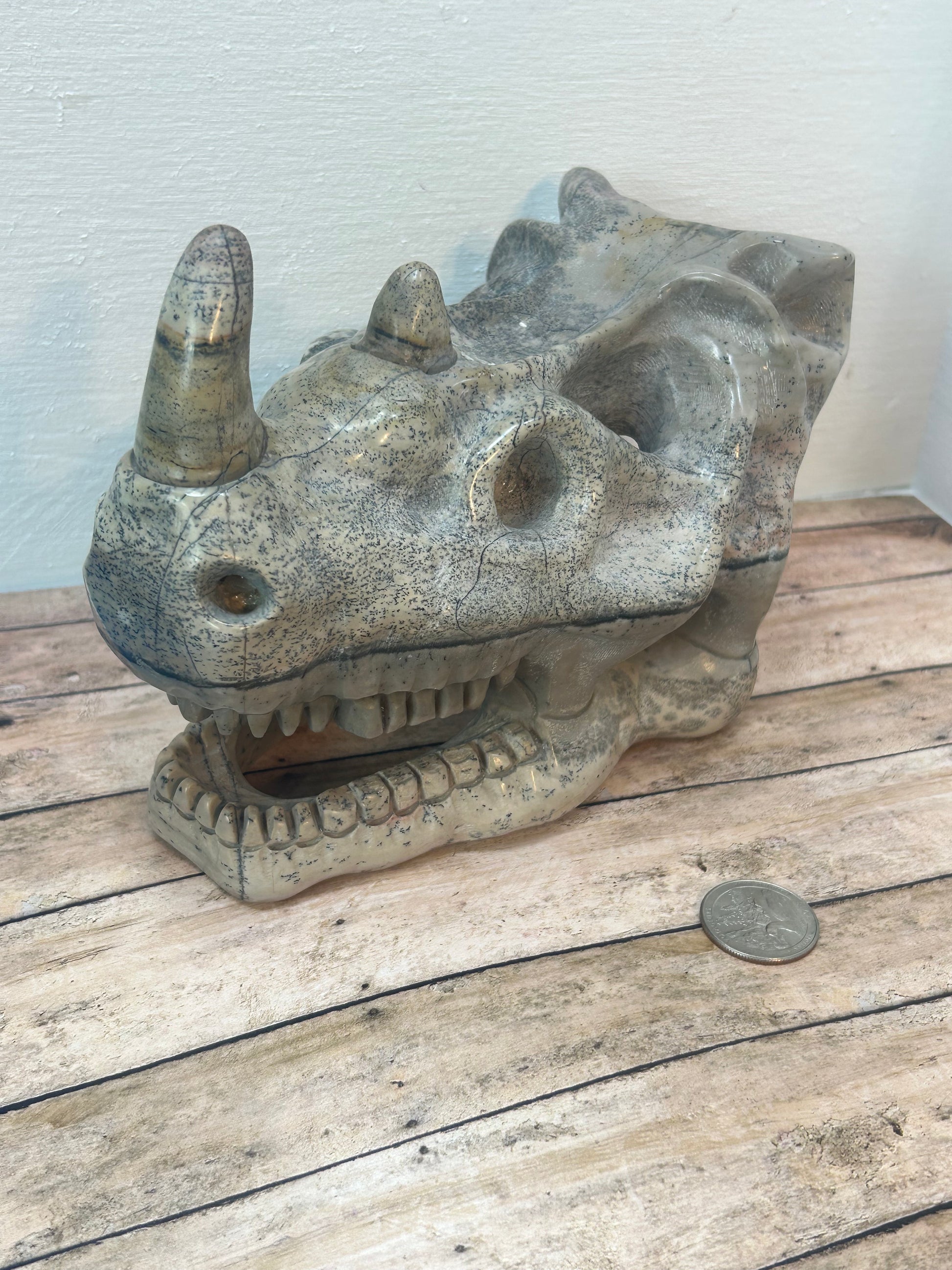 Each Dino Skull with Horn is intricately crafted from authentic Picasso Jasper, showcasing unique patterns that resemble natural works of art. The earthy grays, blacks, and occasional hints of brown create a striking contrast, while the detailed carving captures the strength and mystery of prehistoric creatures.