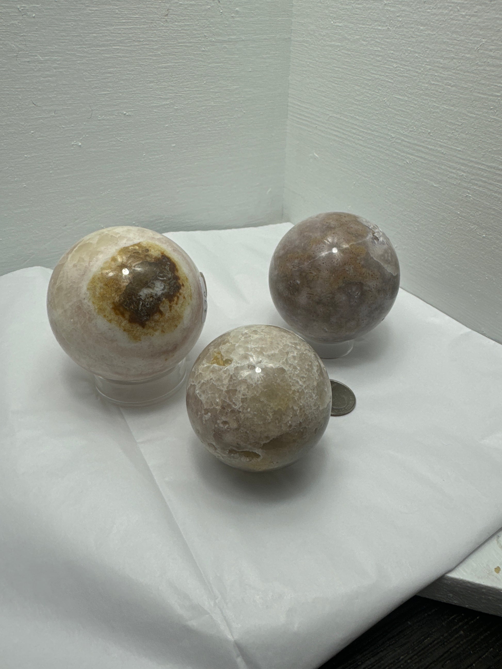 Each sphere is listed by approximate weight and size (e.g., 130g-8cm). Due to the natural variations in Pink Amethyst, each sphere is unique, with its own patterns and shades, making every piece truly one of a kind.