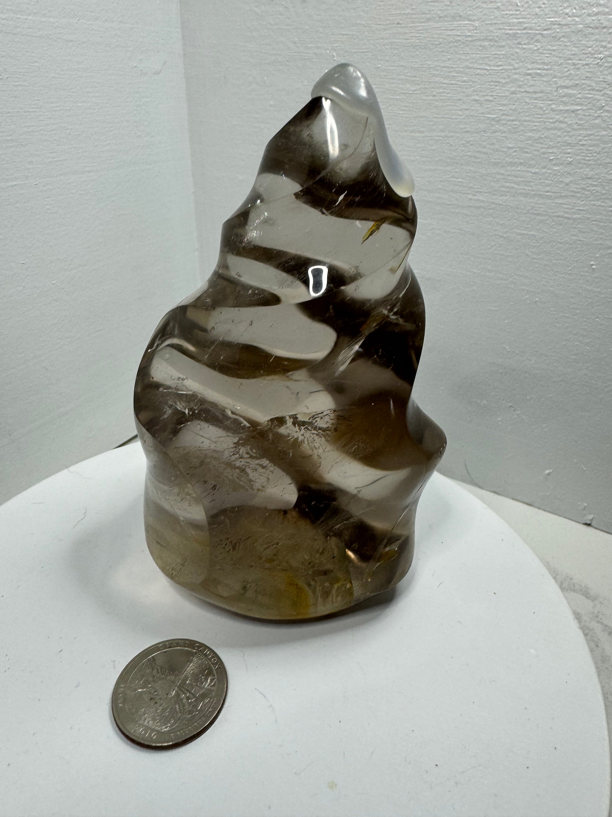 Handcrafted from natural Smokey Quartz crystal, each flame showcases unique patterns and hues of smoky grey and brown, reminiscent of the swirling mists of a mystical forest. Celebrate the sacred elegance and profound energy of your Smokey Quartz Flame as you immerse yourself in its grounding embrace.