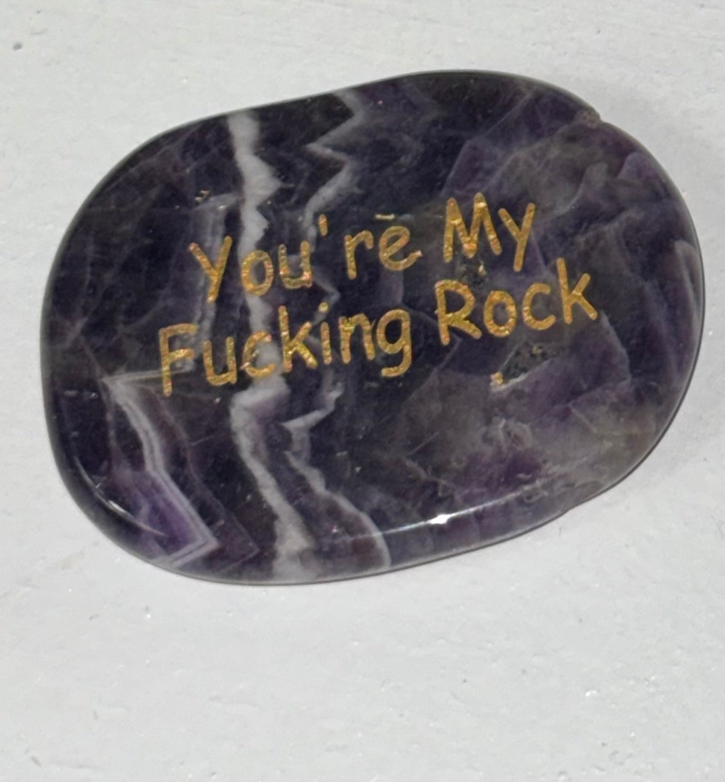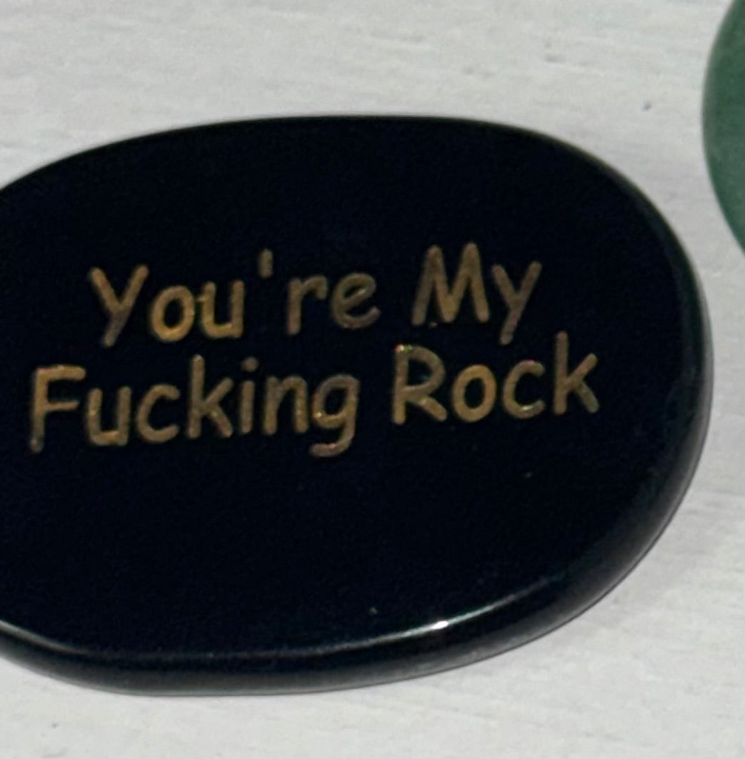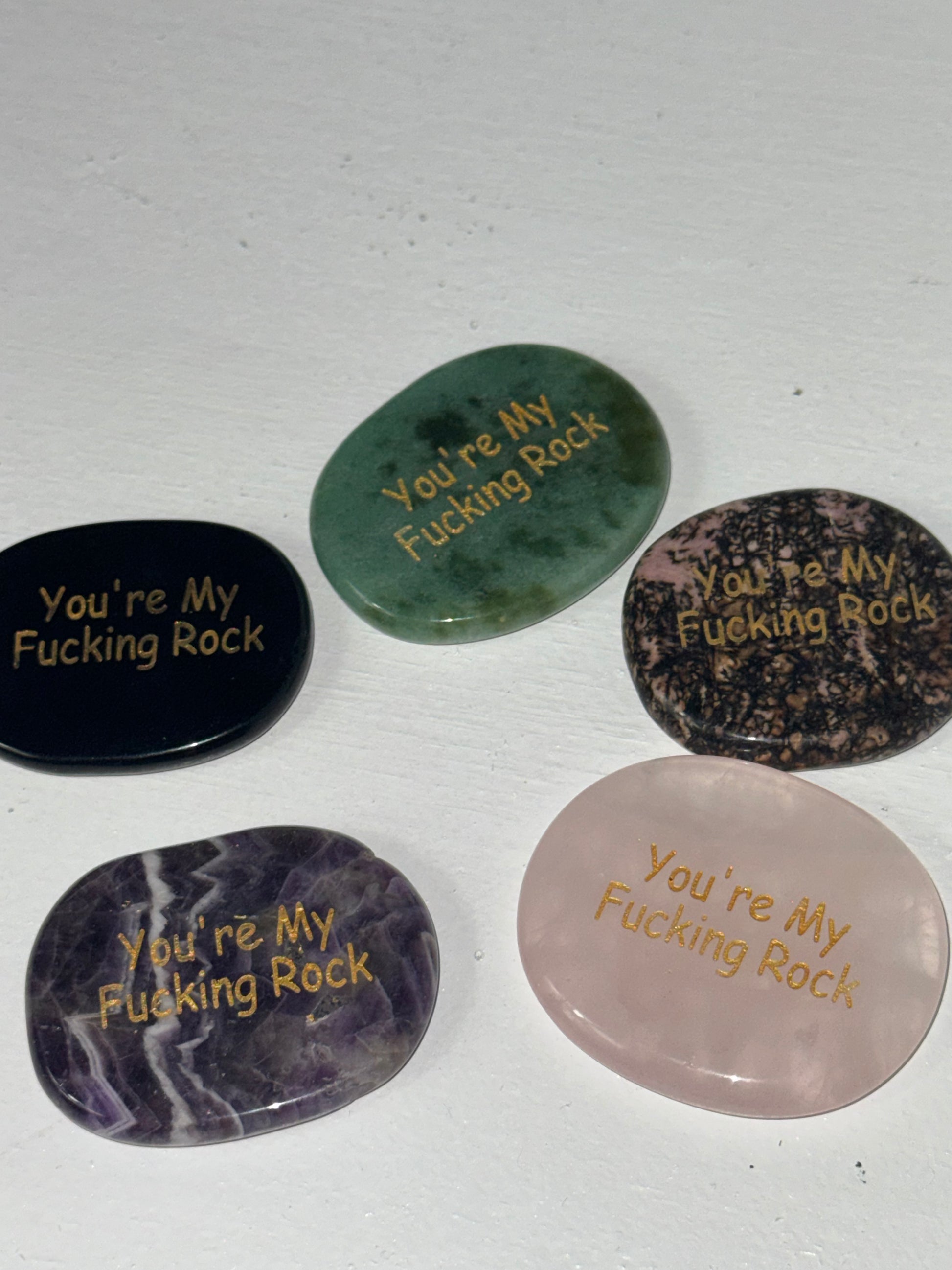 Each worry stone is crafted from genuine gemstones such as rose quartz, obsidian, or amethyst, showcasing unique colors and energies. The phrase “You Are My F%King Rock”* is engraved or etched onto the stone, adding a personal and powerful touch.