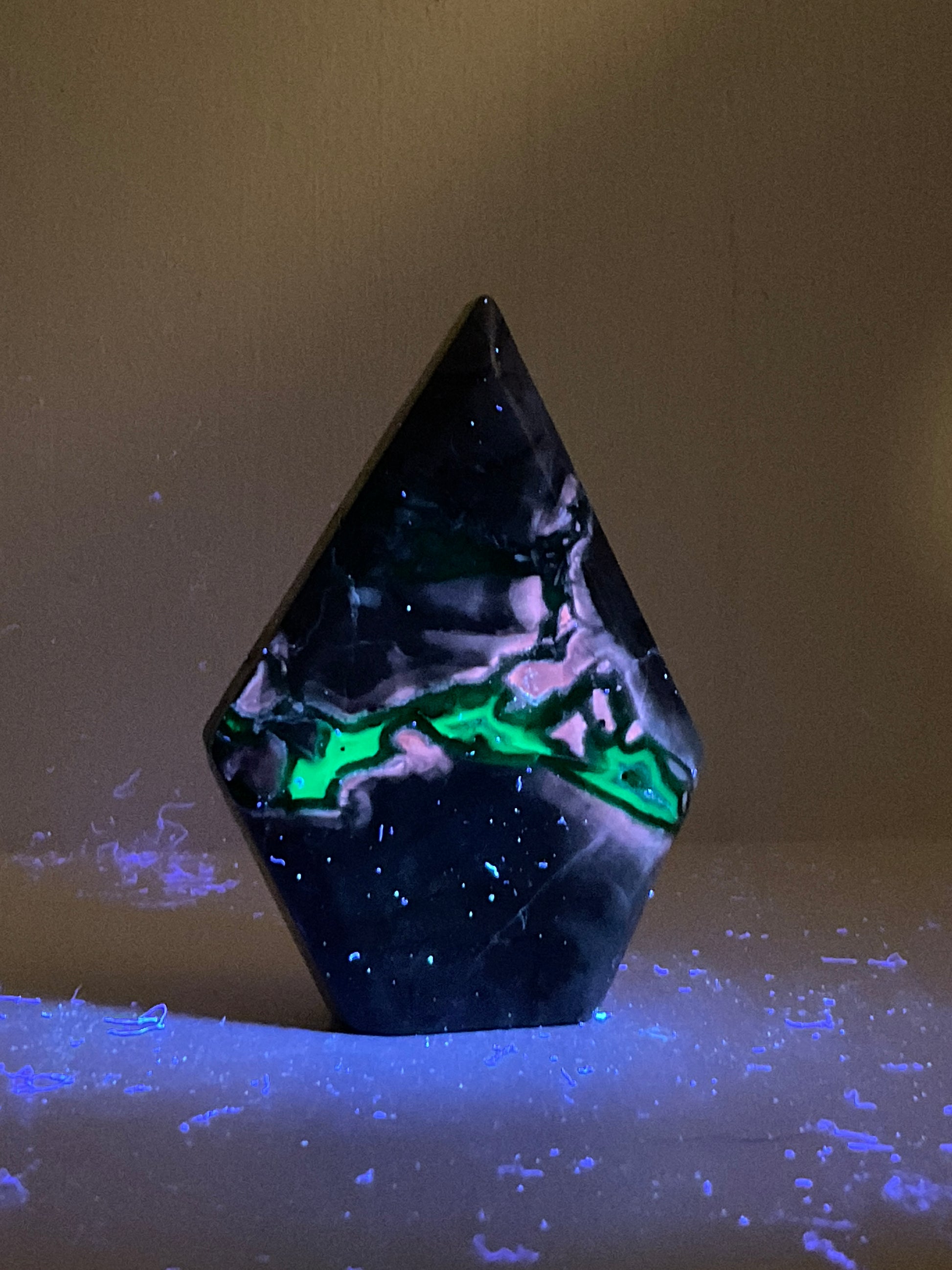 Unleash the fiery energy of our Volcano Agate Diamond, a symbol of resilience, balance, and personal transformation. Known for its dynamic patterns and grounding energy, volcano agate is perfect for embracing change, fostering inner strength, and staying connected to Earthโs energy. This diamond is unique in that includes both green and pink UV reaction!