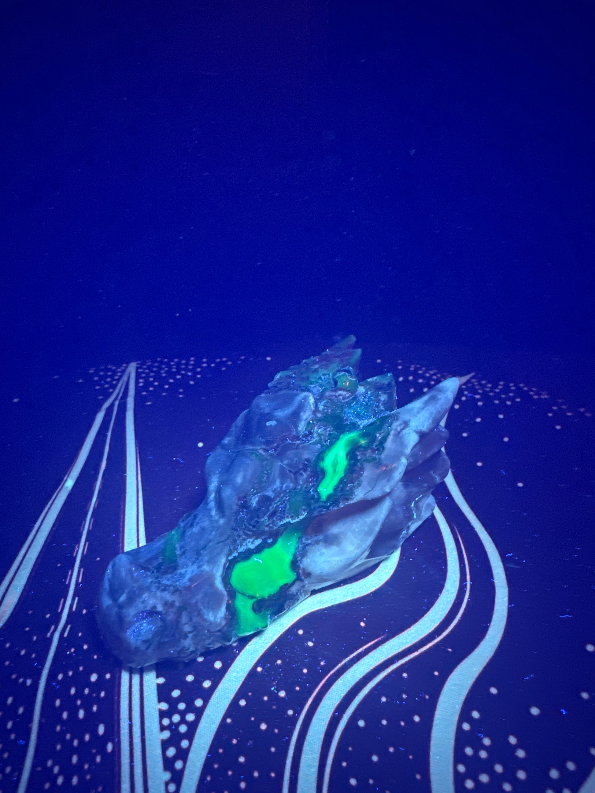 • UV Reactive Glow: This unique Volcano Agate Dragon Skull reveals a striking, bright green glow under UV light, adding an element of enchantment to its energy. This UV reactivity enhances its mystical aura, making it perfect for magical or ambient settings.