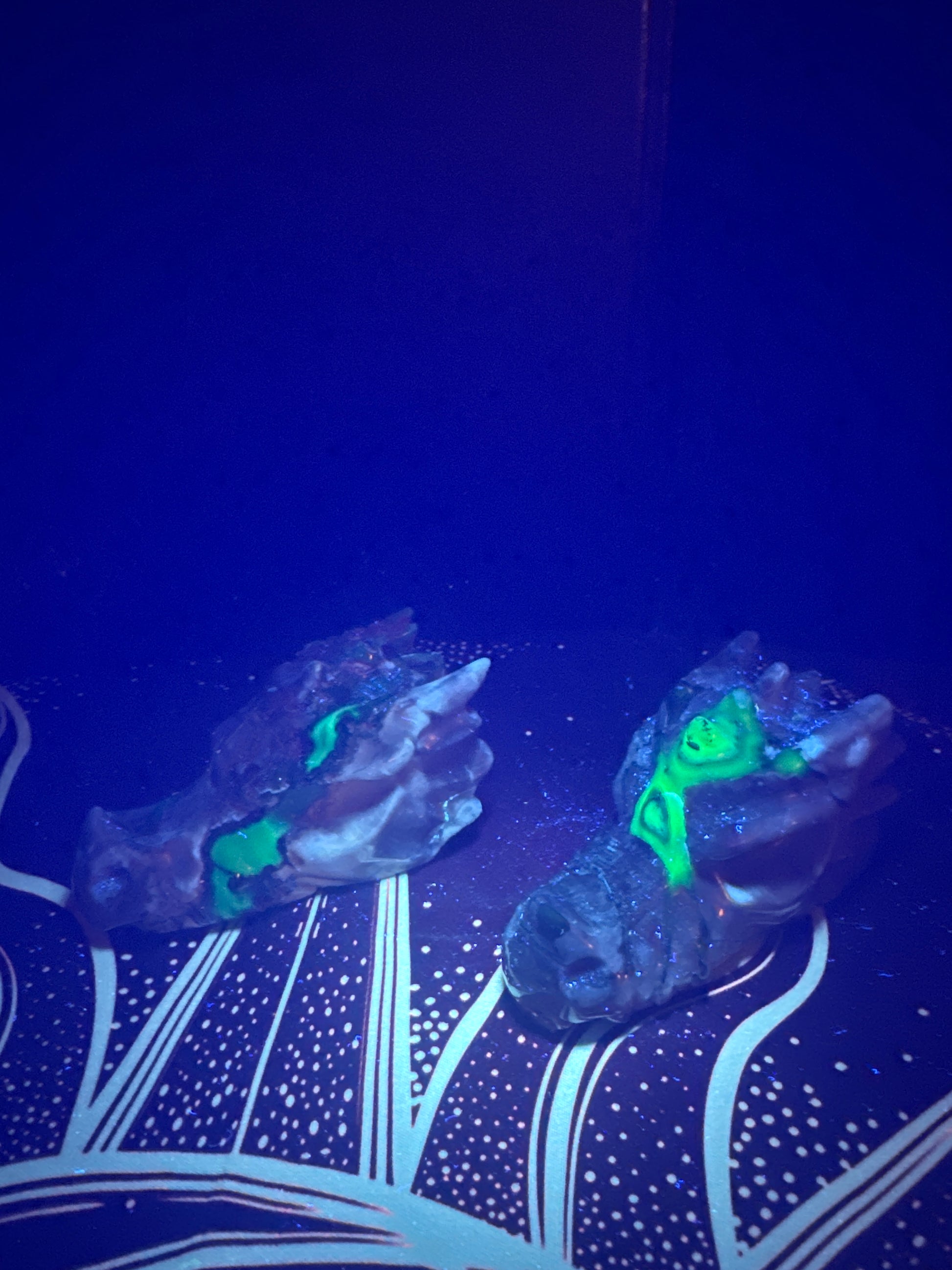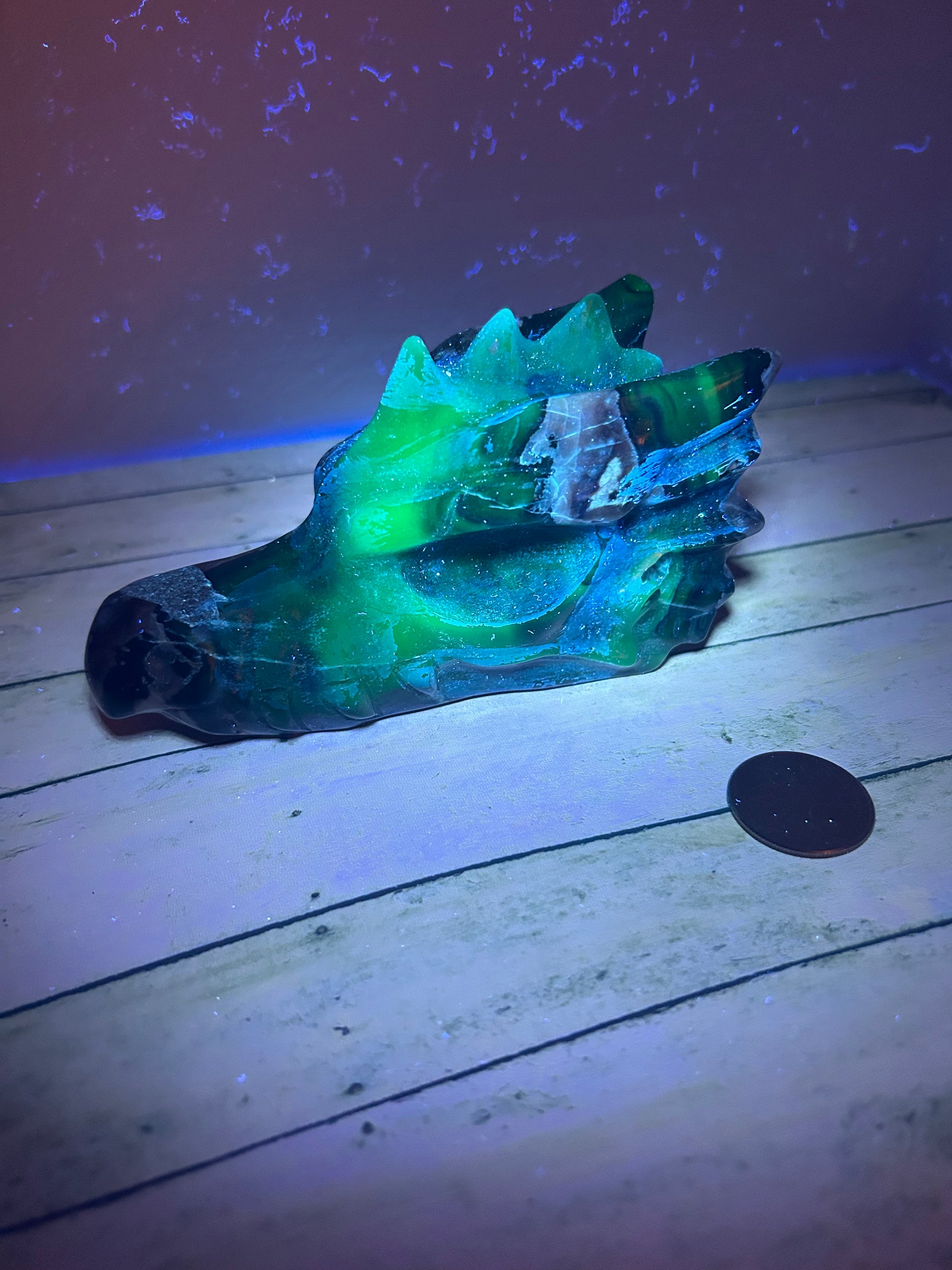 Channel the grounding, transformative energy of our Volcano Agate Dragon Skull, a mesmerizing piece that combines the fierce power of the dragon with the stabilizing properties of Volcano Agate. Known for its connection to Earth’s core energies, Volcano Agate promotes strength, resilience, and personal growth, and this particular piece glows bright green under UV light, adding a magical touch to its powerful energy.