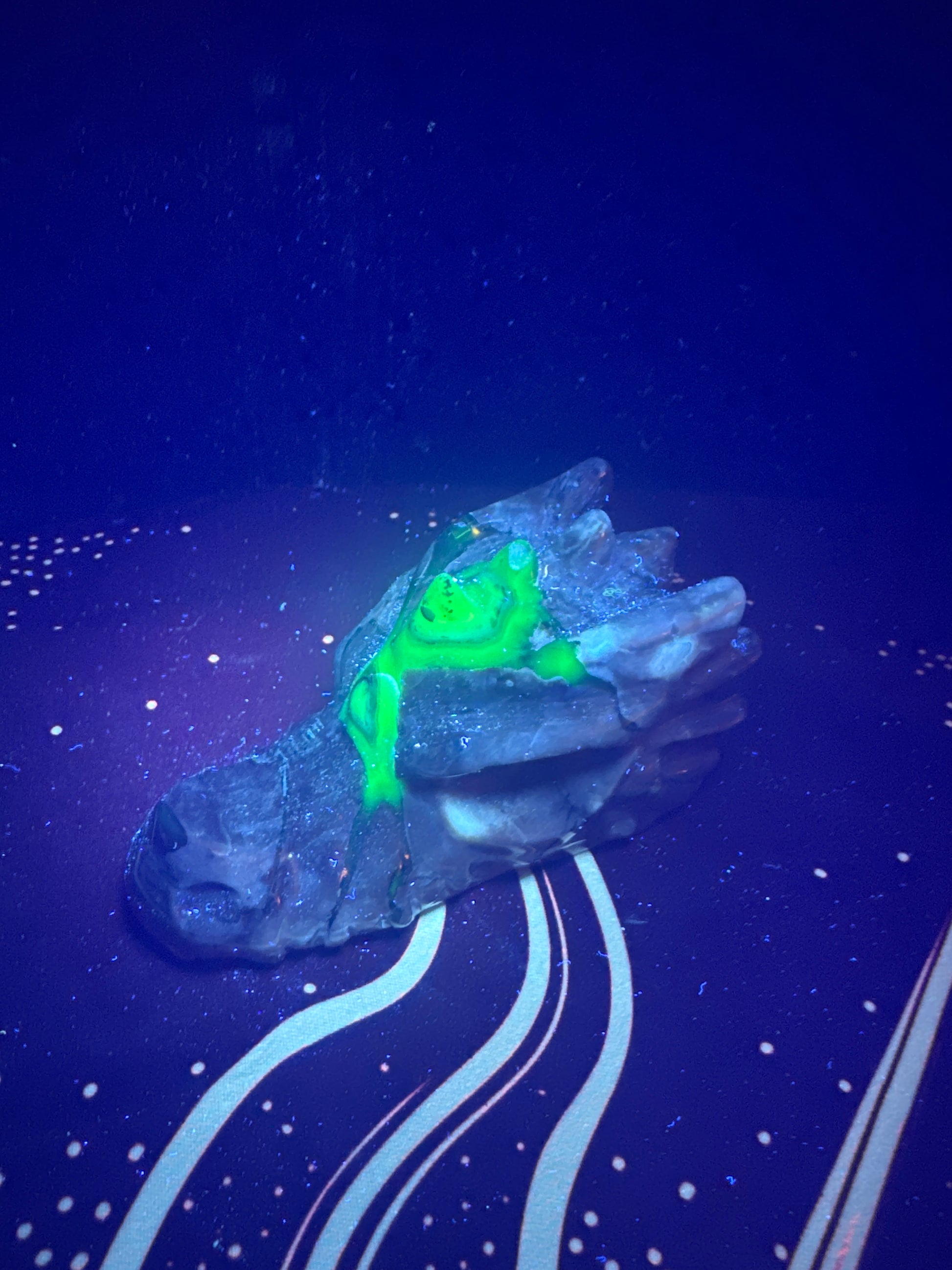 Place this UV-reactive Volcano Agate Dragon Skull in your meditation space, office, or home to harness its grounding, protective, and transformative energy. Its unique green glow under UV light adds a mystical ambiance, inspiring resilience and emotional clarity.