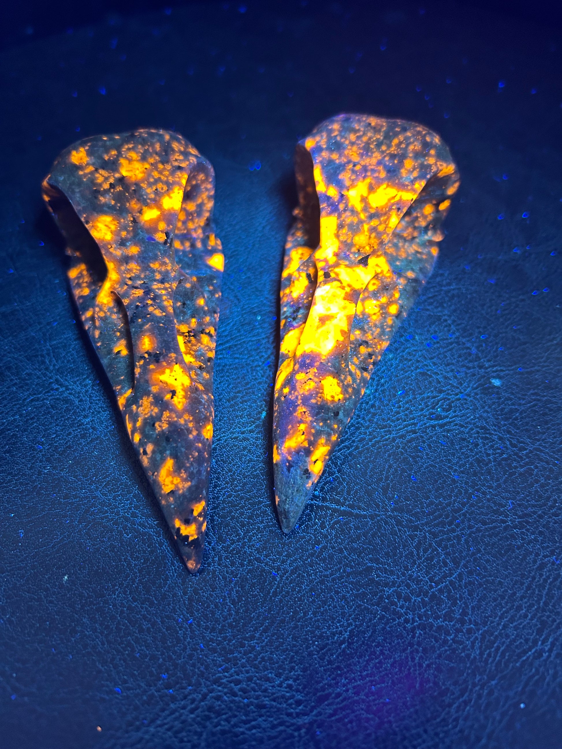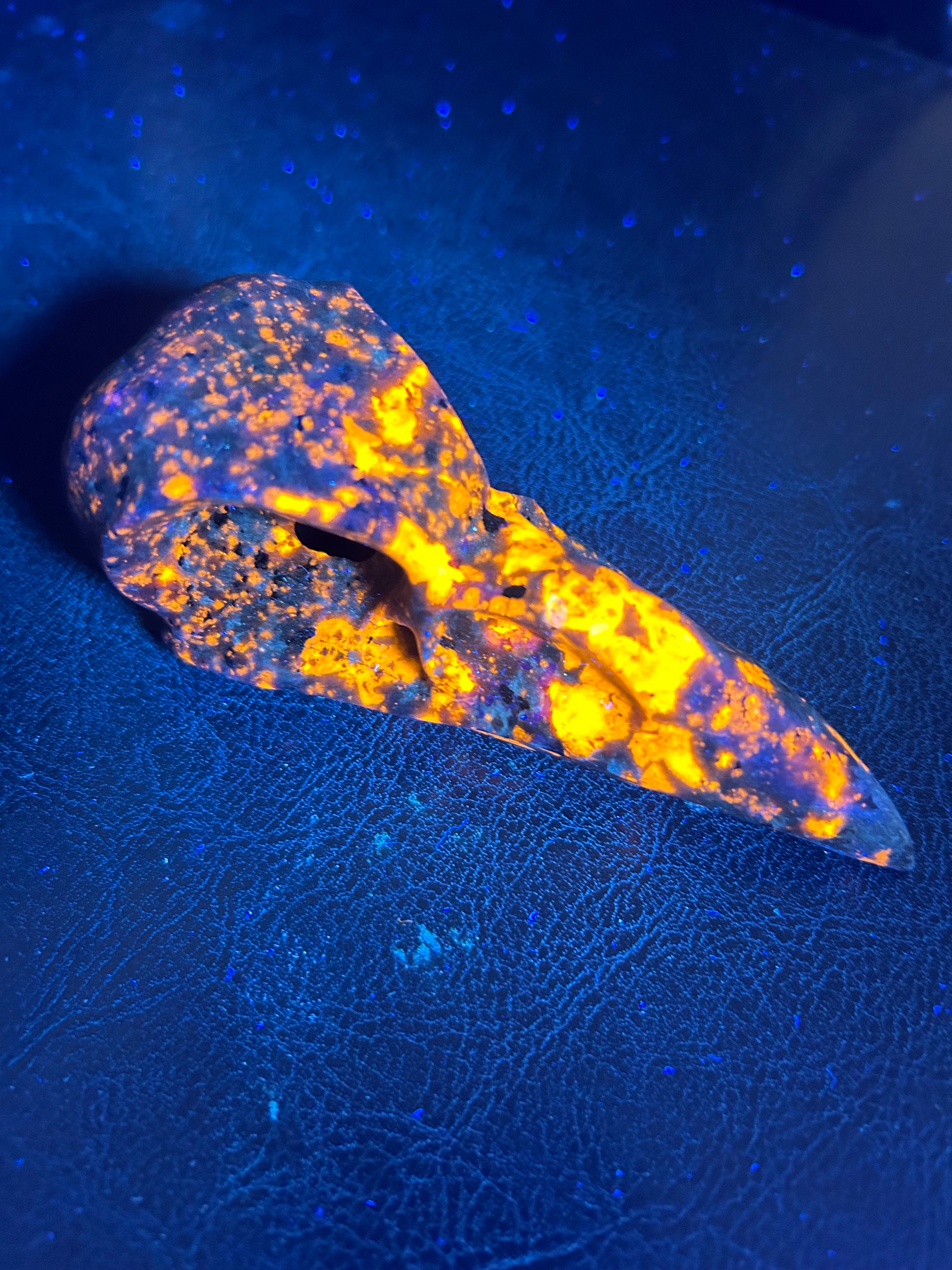 Carved from Yooperlite, this raven skull reveals a captivating glow under UV light, showcasing intricate details that honor the intelligence and mysticism of the raven. The stone’s speckled gray tones with bursts of fluorescence add a cosmic, otherworldly allure.